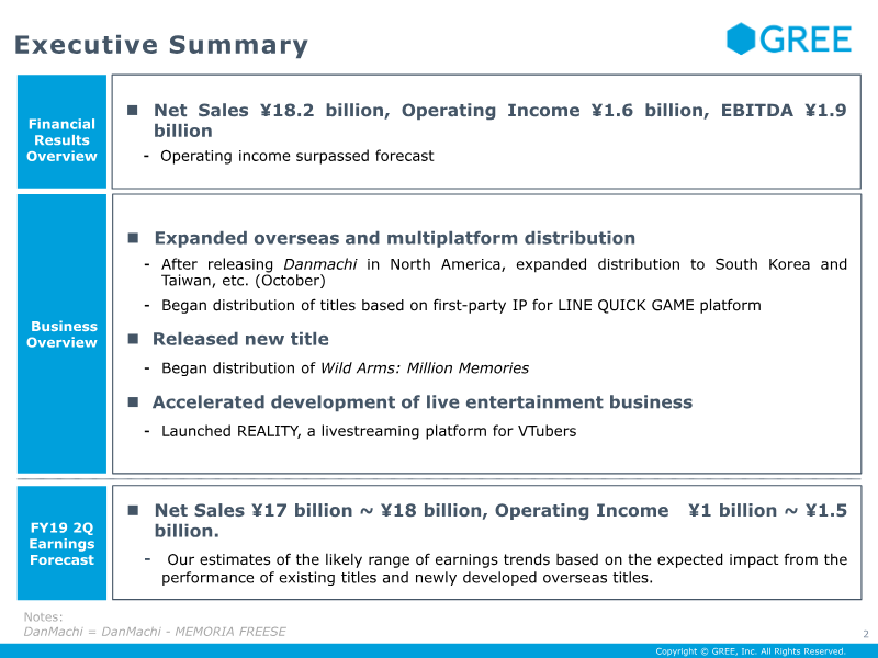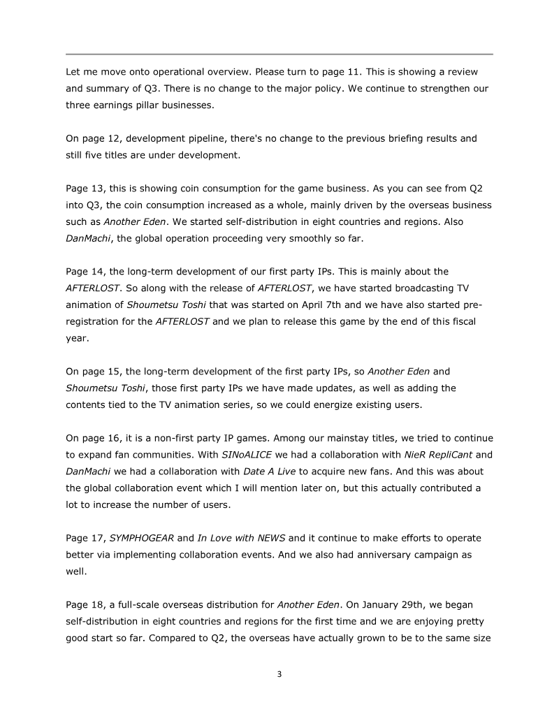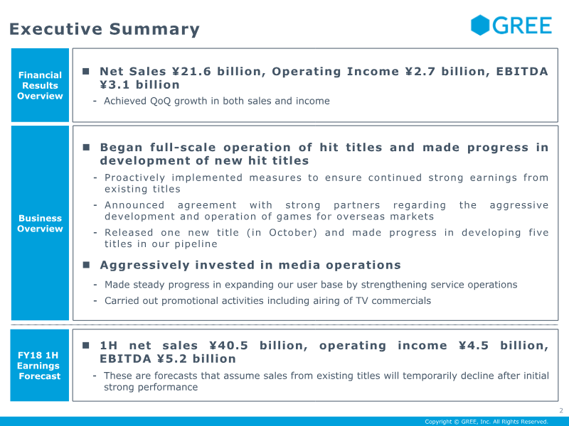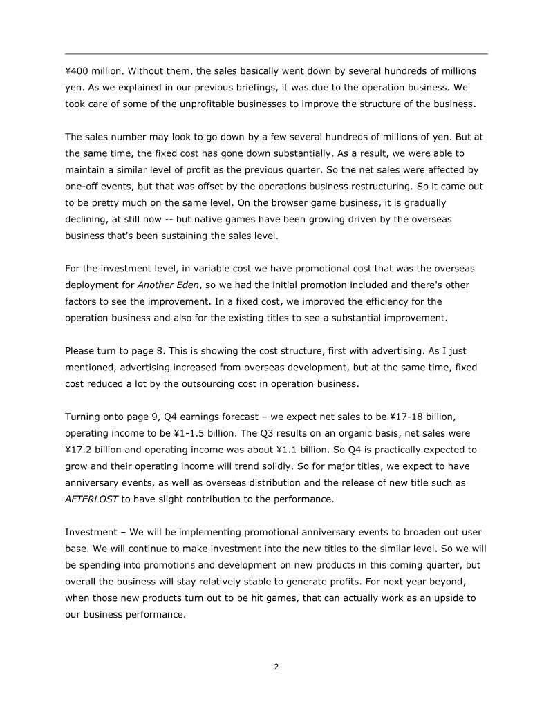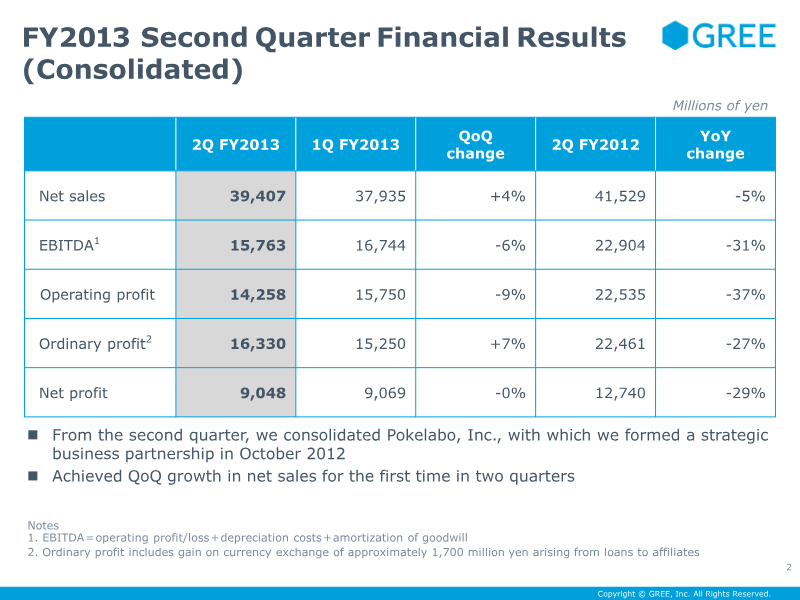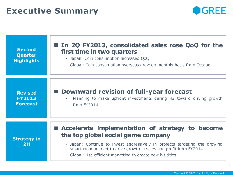 The quarterly financial release outlines a mixed performance for FY2013 second quarter, with net sales rising 4 % QoQ to ¥39.4 billion but falling 5 % YoY, while EBITDA and operating profit declined sharply by 6 % and 9 %, respectively. Net profit remained flat QoQ at ¥9.0 billion but dropped 29 % YoY, reflecting higher costs and a one‑time currency gain. Consolidation of Pokelabo in October contributed to the QoQ sales growth, and the company noted a 35 % increase in cost of sales driven by higher labor and advertising expenses, alongside a 60 % rise in depreciation. Geographically, Japan remains the core market; coin consumption grew QoQ by 600 million coins, with strong performance in native titles such as “Driland” and IP‑based releases. Overseas coin consumption has been rising monthly since October, with new in‑house and co‑branded games expected to contribute from Q3 onward. The company plans aggressive smartphone investments in H2, targeting hit titles across new genres (MMO, FPS) and leveraging efficient marketing to balance lifetime value against cost per install. The revised FY2013 forecast reflects a downward revision of net sales to ¥170 billion (−17.9 % from prior forecast) and operating profit to ¥60 billion (−32.4 %). The outlook hinges on postponed releases in H2 and continued hiring to support smartphone growth, with anticipated increases in customer‑support and compliance costs. Overall, the report signals a strategic pivot toward diversified game genres and international expansion while managing cost pressures in a competitive mobile gaming landscape.
