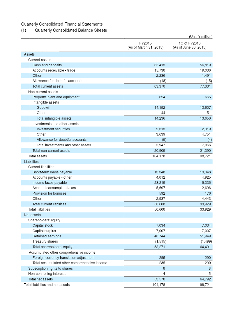 The quarterly report presents mixi, Inc.’s consolidated financial performance for the first quarter of fiscal 2016 (April 1–June 30, 2015). Net sales surged to ¥50.08 billion from ¥12.72 billion a year earlier, reflecting a 293.8 % increase driven by the Entertainment and Media Platform segments. Operating income rose to ¥24.35 billion, a 423.1 % jump, while ordinary income reached ¥24.34 billion and profit attributable to the parent climbed to ¥15.96 billion, a 446.8 % rise. Comprehensive income for the quarter was ¥15.97 billion, up 450.5 % from the prior year’s negative figure. Total assets stood at ¥98.72 billion, down from ¥104.18 billion in March 2015, while net assets increased to ¥64.79 billion, raising the equity ratio to 65.6 %. Cash and deposits were ¥56.82 billion, a significant increase from ¥65.41 million at the end of March 2015. The company’s share‑based metrics show profit per share and diluted profit per share at ¥197.97 and ¥197.81 respectively, reflecting a five‑for‑one stock split executed in July 2014. The report forecasts full‑year 2016 results of ¥185.0 billion in sales, ¥80.0 billion operating income, and ¥52.0 billion profit attributable to the parent, with no revisions to prior forecasts. Dividend guidance remains unchanged, projecting a total of ¥129 million for the fiscal year ending March 2016. The document notes no changes in subsidiary scope or accounting policy, except for the adoption of revised Japanese GAAP standards effective from the first quarter. The company also disclosed a July 2015 overseas share offering, raising ¥5.33 billion to fund debt repayment and future entertainment‑business advertising.