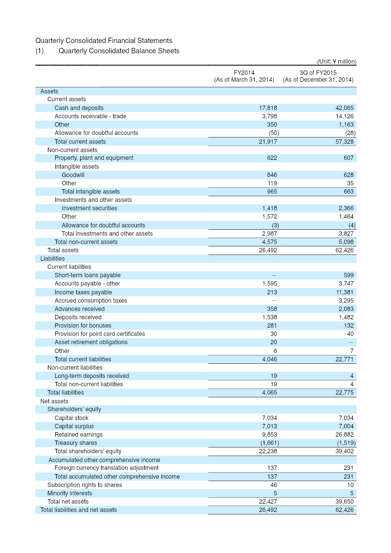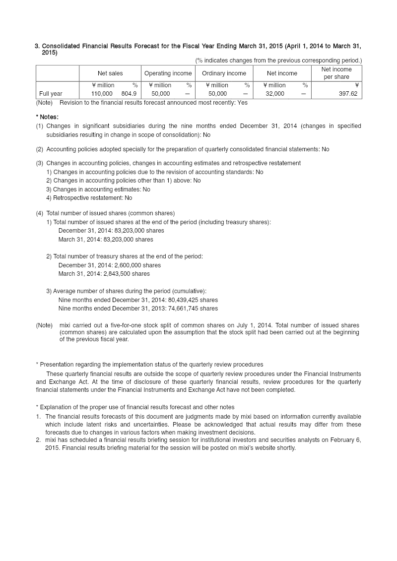 The nine‑month financial results for mixi, Inc., covering April 1 to December 31 2014, demonstrate a dramatic turnaround from the prior year. Net sales surged 973.7 % to ¥68,265 million, driven by a sharp increase in external customer sales across the Media & Content and Life Events businesses. Operating income rose to ¥29,927 million from a loss of ¥509 million in the same period last year, resulting in an ordinary income of ¥29,979 million and a net profit of ¥19,104 million. Comprehensive income for the period was ¥19,199 million, compared with a loss of ¥1,481 million the previous year. Net income per share reached ¥237.50 (diluted ¥236.88) versus a loss of ¥21.08 per share in 2013. Total assets expanded from ¥26,492 million to ¥62,426 million, while equity grew from ¥22,238 million to ¥39,402 million, raising the equity ratio to 63.5 % from 84.5 %. Cash and cash equivalents increased markedly, ending the period at ¥42,065 million. The company’s liquidity improved as current liabilities rose to ¥22,771 million, largely due to higher accounts payable and tax provisions. The forecast for the fiscal year ending March 31 2015 projects net sales of ¥110,000 million and a net income of ¥32,000 million. No changes in accounting policies or significant subsidiaries were reported for the nine‑month period, and a five‑for‑one stock split on July 1 2014 was accounted for in per‑share calculations. The results reflect mixi’s strategic realignment of reportable segments and expansion into new business areas, underpinning its return to profitability.