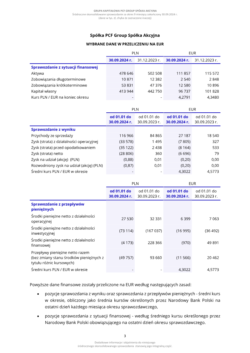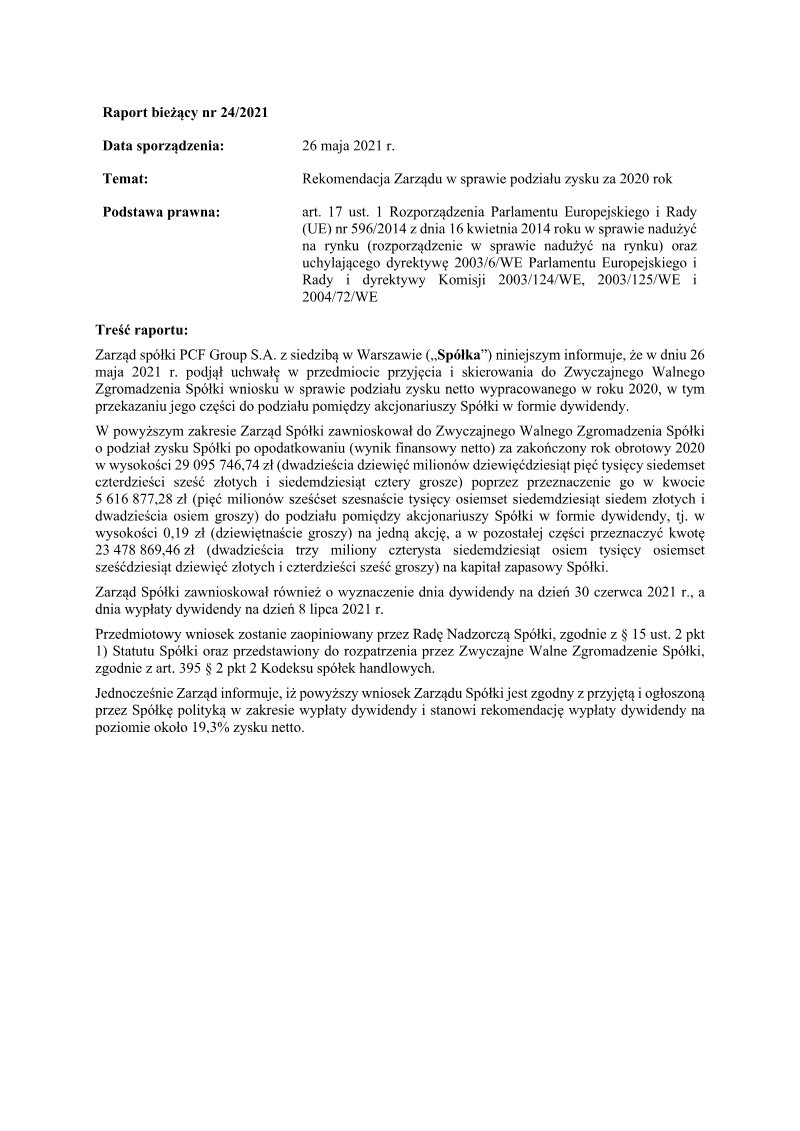 The report details the completion of PCF Group S.A.’s public subscription for 2,062,512 new Series B shares and the simultaneous sale of an equal number of existing Series A shares. The transaction aimed to secure listing on the Warsaw Stock Exchange and involved all 27,500,000 existing Series A shares. The subscription period ran from 26 November to 3 December 2020 for individual investors and employee‑shareholder tranches, while institutional investors were engaged from 27 November to 9 December. Allocation occurred on 11 December, with all offered shares fully distributed. The offering was structured into three tranches: individual investors (price 46.00 PLN), employee‑shareholder tranches (41.40 PLN), and institutional investors (50.00 PLN). Employee‑shareholder bids were treated preferentially, and a 98.486 % reduction applied only to individual investor bids for new shares. Institutional investors received both new and existing shares, with 284 institutions subscribing to the sale of existing Series A shares. Total subscription volume for new shares reached 42,310,783 bids across all tranches, while the sale of existing shares attracted exactly 2,062,512 bids from institutions. Allocation matched the offered quantities: 2,062,512 new shares and 2,062,512 existing shares were issued. The average price for new shares varied by tranche, with the institutional tranche at 50 PLN, resulting in a subscription value of approximately 100.29 million PLN and a sale value of about 103.13 million PLN. The report notes that detailed cost breakdowns and final pricing will be disclosed in subsequent filings, as the company has not yet finalized all expense items. The transaction represents a significant capital‑raising effort, expanding the company’s share base and facilitating its entry onto Poland’s regulated market.