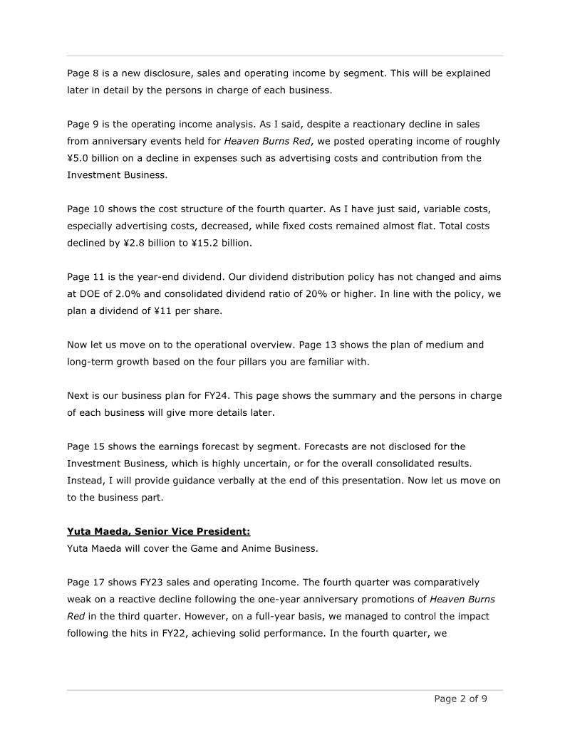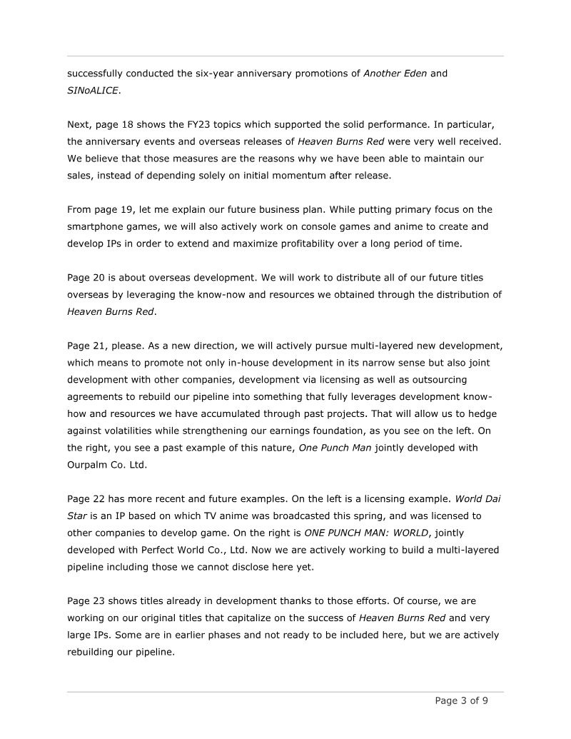 FY2022 Fourth Quarter Financial Results ◼ Net sales ¥74.9 billion, operating income ¥11.5 billion, Full- ⁃ Achieved YoY growth in sales and income year ∙ Produced several hits in the Game Business FY22 ∙ Made aggressive investments in the Metaverse Business and made progress in Actual ∙ developing it into a global business Strengthened the media potential of our Advertising and Media Business and ◼ Net sales ¥20.9 billion, operating income ¥3.8 bill...