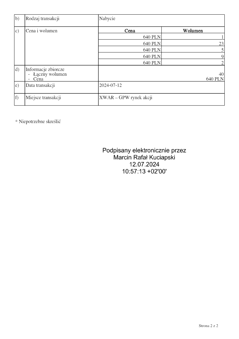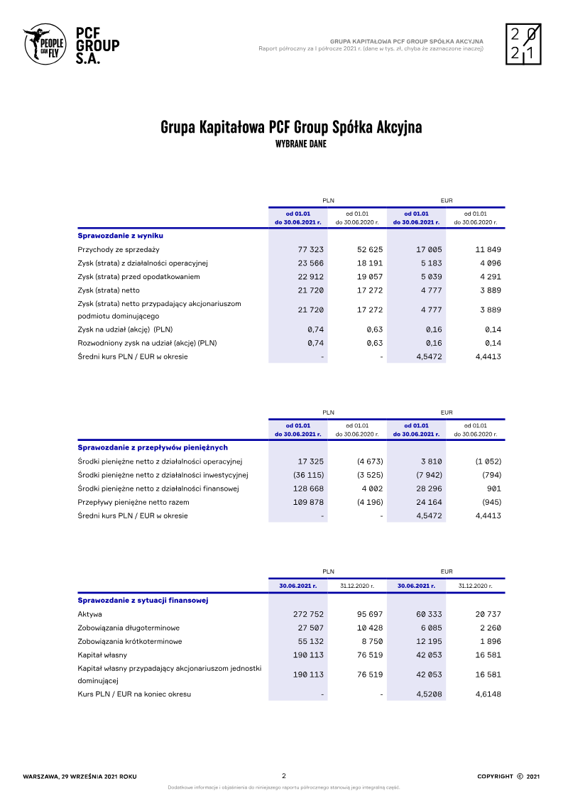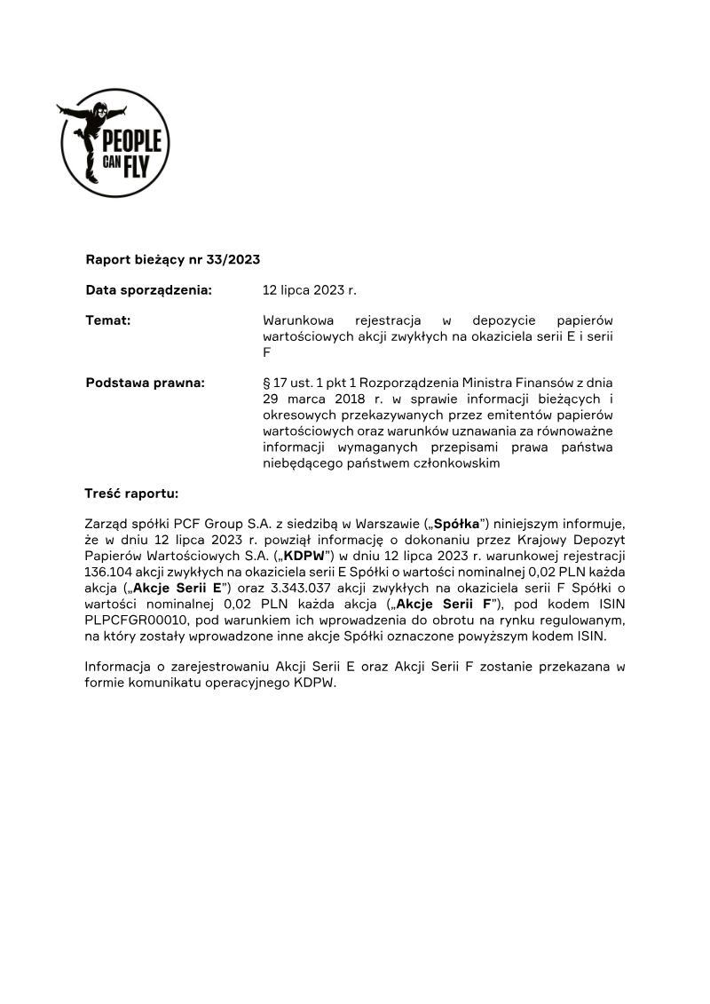 The report discloses that PCF Group S.A., following an extraordinary shareholders’ resolution, completed a demand‑building process for its Series F ordinary shares on 1 June 2023. The company will offer a total of 3,343,037 Series F shares to investors, with 3,342,937 of those directed specifically to Krafton, Inc. under a prior investment agreement. The emission price is set uniformly at 40.20 PLN per share for all investors, including Krafton. The disclosure is limited to informational purposes only and does not constitute an offer or promotion of the shares. It applies exclusively within the European Economic Area, the United Kingdom, and other jurisdictions where such distribution is permitted to qualified or professional investors. The document contains extensive legal caveats, including restrictions on publication and distribution in the United States, Australia, Canada, Japan, South Africa, and other territories where securities law would prohibit such disclosure. It also clarifies that the shares are not registered under U.S. securities law and cannot be offered or sold in those jurisdictions without exemption. The report outlines the regulatory framework governing the issuance, referencing EU Regulation 2017/1129 and Polish public‑company law. It emphasizes that no prospectus is required and that the information should be used only by eligible investors. The document concludes with standard risk‑disclaimer language, noting that future performance is uncertain and that investors should conduct independent due diligence before making any investment decisions.