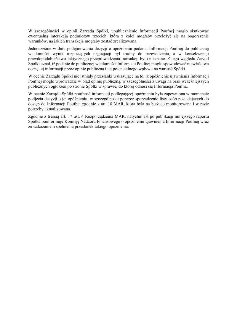 The report discloses a delayed confidential disclosure concerning the creation of a subsidiary, People Can Fly Chicago, LLC (PCF Chicago), under PCF Group S.A. The disclosure follows the acquisition of the Phosphor Games development team on 23 April 2021. The subsidiary was formed under Delaware law on 6 April 2021, as part of a letter‑of‑intent transaction with Phosphor Studios and Phosphor Games, intended to facilitate the acquisition of the development team. The report explains that the creation of PCF Chicago does not guarantee the successful acquisition of the team, and that the subsidiary’s establishment was an intermediate step in a broader strategy. The delay in public disclosure, justified under Article 17(4) of the EU Market Abuse Regulation (MAR), was deemed necessary to protect the company’s legitimate interests. The board argued that premature release could have exposed ongoing negotiations, potentially harming deal terms and the company’s market value. Confidentiality was maintained through a monitored list of individuals with access, in compliance with Article 18 MAR. Upon publication, the company will notify the Polish Financial Supervision Authority of the delay and its justification. The document covers a single corporate action within Poland’s PCF Group, involving entities in the United States and Delaware. It is a regulatory filing dated 23 April 2021, reflecting the company’s compliance with EU market‑abuse rules and its strategic acquisition activities in the gaming sector.