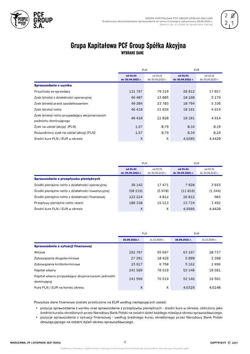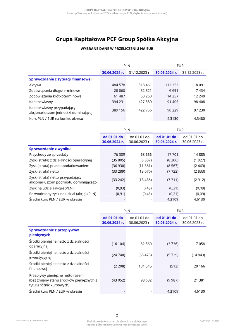 WARSZAWA | 30 WRZENIA 2024 ROKU PEOPLE ZA 0KRES 01.01.2024 - 30.06.2024 Grupa Kapitałowa PCF Group Spółka Akcyjna WYBRANE DANE W PRZELICZENIU NA EUR PLN EUR 30.06.2024 r. 31.12.2023 r. 30.06.2024 r. 31.12.2023 r.