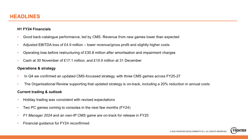 The interim financial results for the six‑month period ending 30 November 2023 demonstrate a mixed performance driven largely by strong back‑catalogue sales, particularly within the creative management simulation (CMS) segment. Total revenue fell 17 % to £47.7 million, with 72 % derived from pre‑period titles; CMS games contributed £26.3 million, representing 55 % of revenue and an 81 % sustain rate versus the previous year. New‑game launches underperformed, with F1 Manager sales down 34 % and Warhammer Age of Sigmar: Realms of Ruin missing launch targets. Gross profit declined 9 % to £33.0 million, while gross margin improved by six percentage points to 69 %. Operating costs rose modestly; research and development expense increased 1 % to £24.7 million, sales and marketing rose 21 %, and general & administrative costs grew 2 %. Adjusted EBITDA swung to a loss of £4.9 million from a £0.6 million profit in the prior period, largely due to higher operating costs and lower revenue. Cash balances stood at £17.1 million on 30 November, down from £19.9 million at year‑end, reflecting ongoing investment in development and restructuring. An organisational review announced in October targets a 20 % reduction in annual operating costs, with phase one completed and phase two slated for February. The company maintains FY24 revenue guidance of £80‑95 million and an adjusted EBITDA loss target of £9 million, achievable at the upper end of the revenue range. Geographically, the results cover the UK‑listed Frontier Developments plc; time coverage is H1 FY24 (June–November 2023). Methodology relies on standard IFRS accounting, with adjustments to derive adjusted EBITDA excluding restructuring, impairment and share‑based payments. The report underscores a strategic pivot toward CMS titles across FY25‑27, with planned console releases of two PC games and an own‑IP CMS title in FY25.