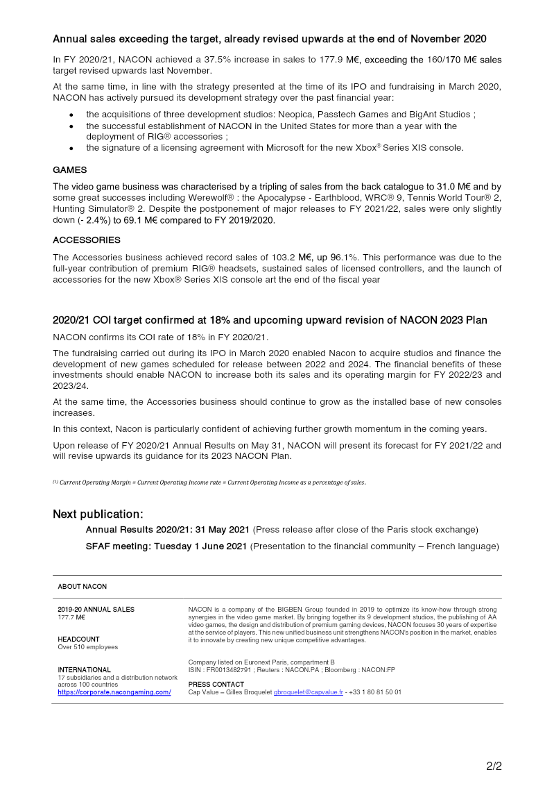 Nacon reported FY 2020/21 sales of €177.9 million, a 37.5 % increase over the previous fiscal year and surpassing the revised target of €160–170 million. Gaming revenue remained flat at €69.1 million, while accessories sales surged to €103.2 million, up 96.1 %. The accessories boom was driven by premium RIG® headsets, licensed controllers, and new Xbox Series X|S accessories launched late in the year. Back‑catalogue game sales tripled to €31 million, contributing high margins and offsetting a slight decline in overall game sales. Digital game sales rose to 75 % of Q4 revenue, up from 70 % the prior year. Quarterly performance highlighted a strong fourth quarter: €42.6 million in sales, a 68.7 % increase over Q4 2019/20, with gaming and accessories both outperforming. The company’s strategy, outlined during its March 2020 IPO, included acquisitions of Neopica, Passtech Games, and BigAnt Studios, expansion into the U.S. market with RIG® accessories, and a licensing agreement with Microsoft for Xbox Series X|S. These moves are expected to lift sales and operating margins in FY 2022/23 and 2023/24. Nacon confirmed a 18 % operating income rate for FY 2020/21 and plans to revise its 2023 guidance upward. The company operates globally, with a distribution network in 100 countries and over 510 employees across 17 subsidiaries.