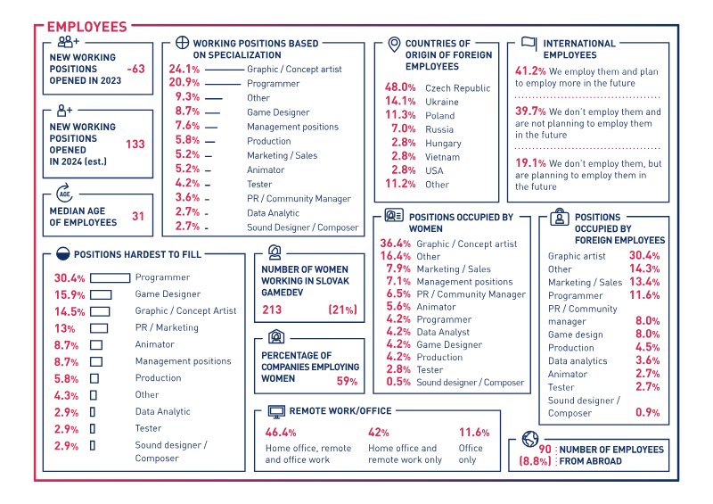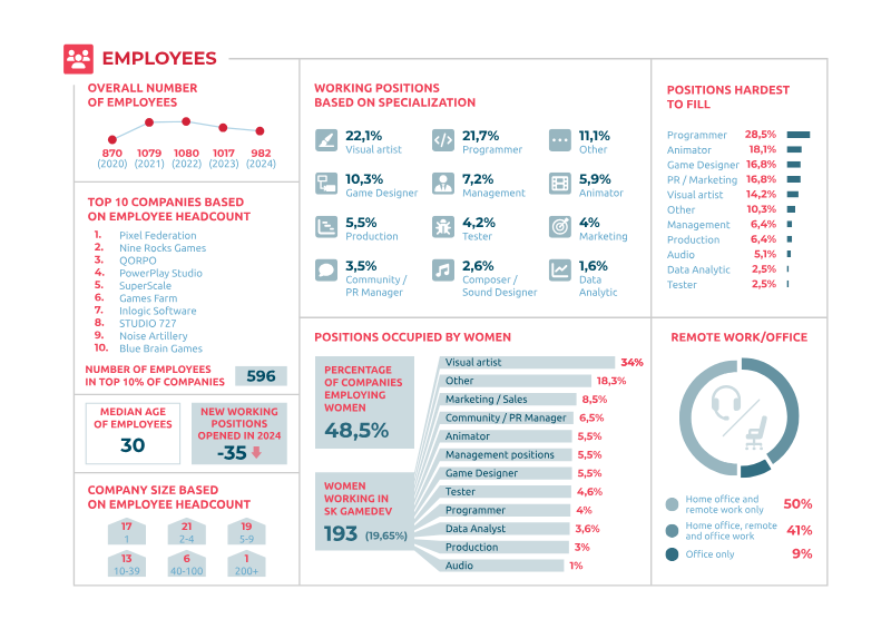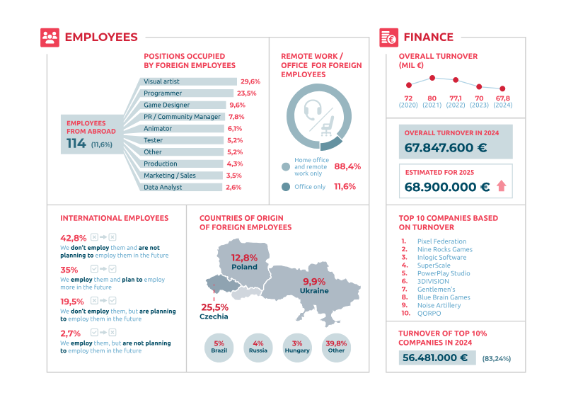 Financially, the sector generated a total turnover of approximately 67.8 million euros in 2024, with a high degree of market concentration; the top 10% of companies account for over 83% of this revenue. The workforce consists of 982 employees with a median age of 30 to 35. While the industry remains male-dominated, women represent nearly 20% of the workforce, primarily in visual arts and marketing roles. Foreign talent is a significant component of the ecosystem, comprising 11.6% of the total headcount, with employees largely sourced from Poland, Ukraine, and Czechia. Remote work is highly prevalent, with 91% of companies offering some form of home office or fully remote arrangements.