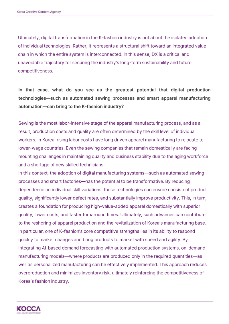 The interview with Professor Lee Su‑Hyun of Seoul National University articulates digital transformation (DX) as a comprehensive restructuring of the Korean fashion value chain, extending beyond e‑commerce to encompass AI‑driven design, smart‑factory automation, and data‑centric marketing. By leveraging generative AI for 3‑D virtual prototyping, automated sewing, digital twins, and metaverse‑enabled retail experiences, the industry can cut sample costs, shorten lead times, and enhance personalized consumer interactions while supporting carbon‑neutral objectives such as on‑demand production and circular‑economy tracking.