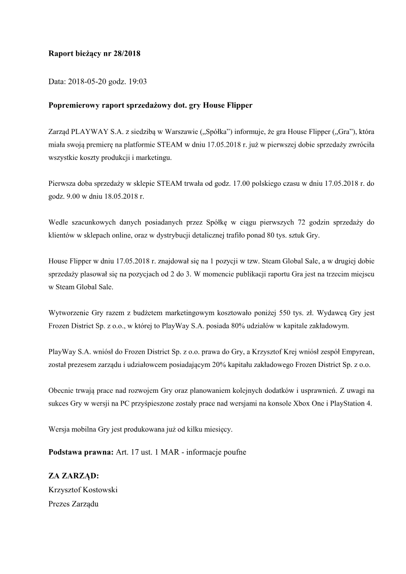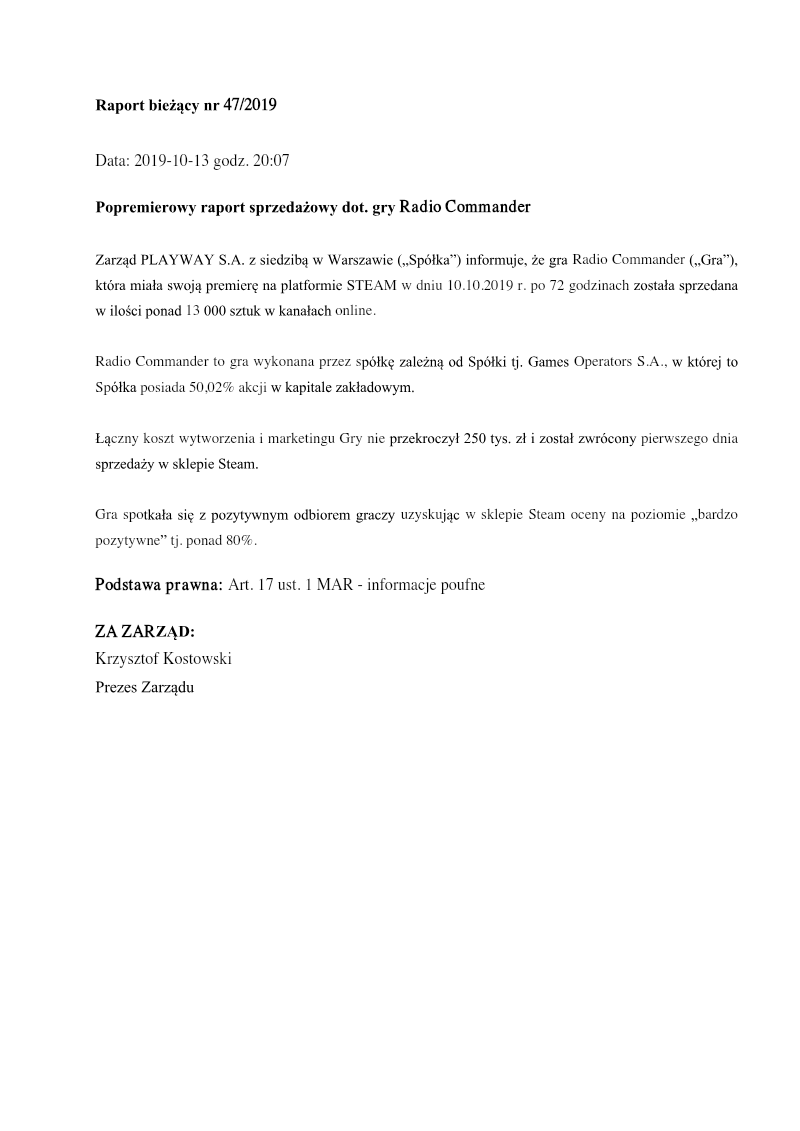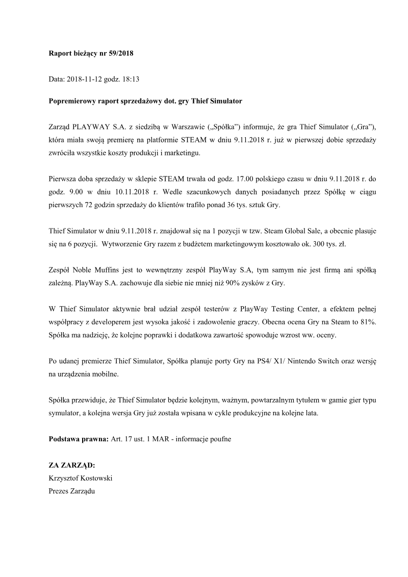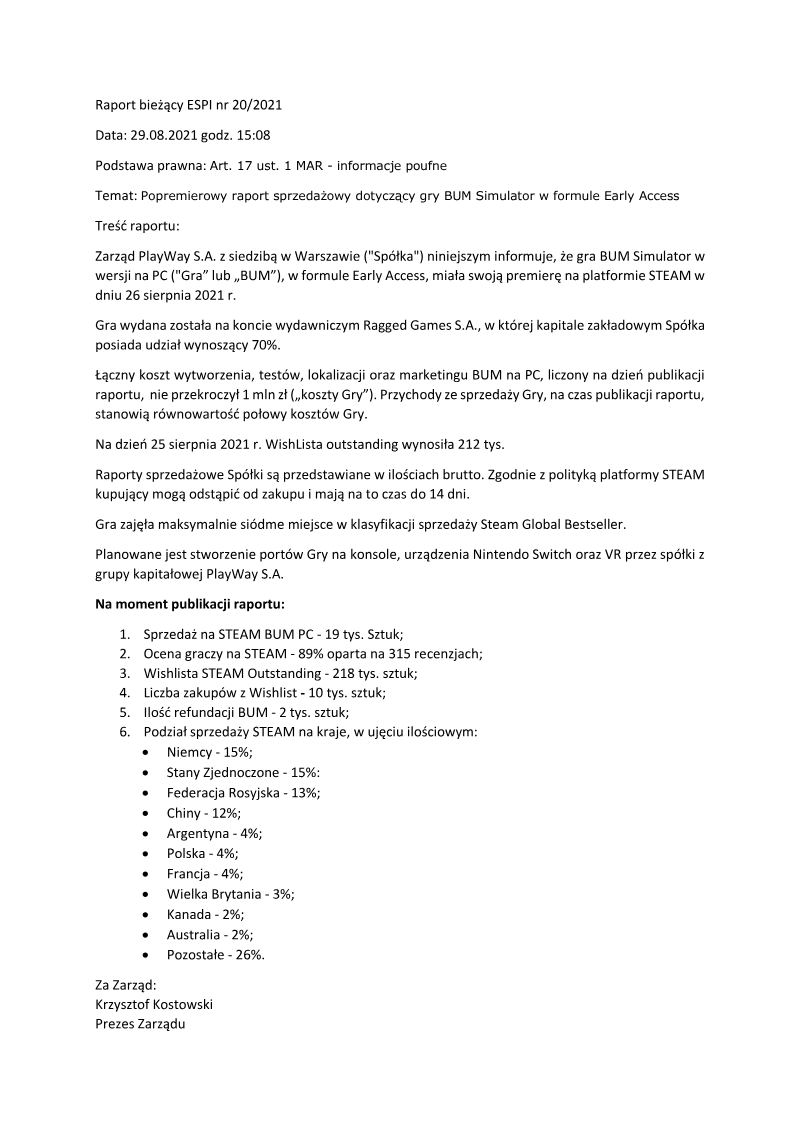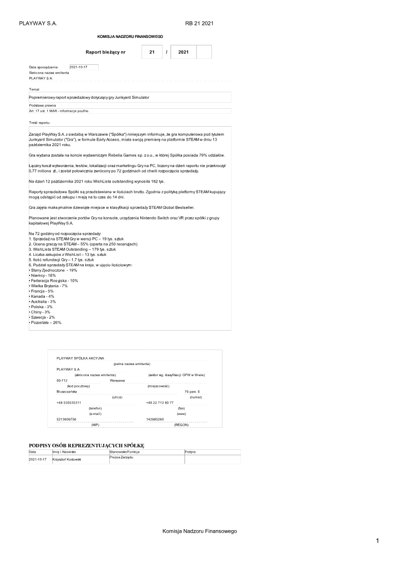 The release of Junkyard Simulator in Early Access on the Steam platform occurred on October 13, 2021, under the publishing label of Rebelia Games, a subsidiary in which PlayWay S.A. holds a 79% stake. Within the first 72 hours of availability, the title achieved a gross sales volume of 19,000 units on PC. This initial performance allowed the project to recoup approximately half of its total development, testing, localization, and marketing costs, which were capped at 0.77 million PLN.