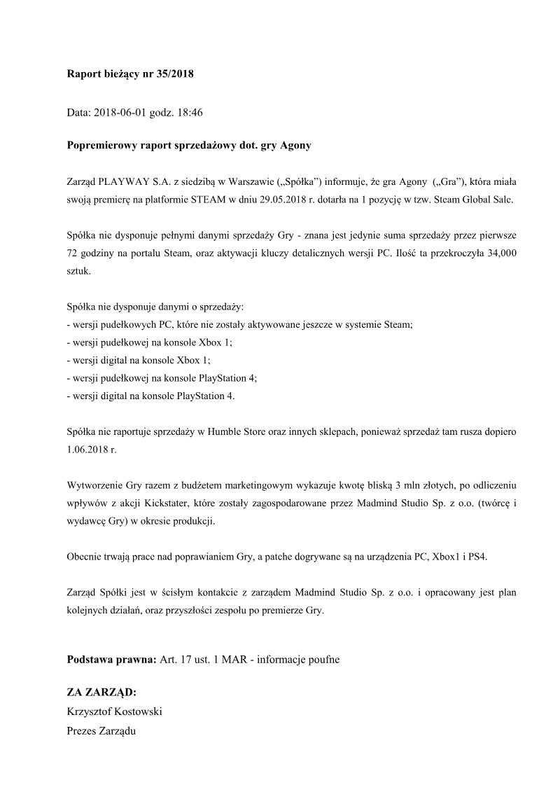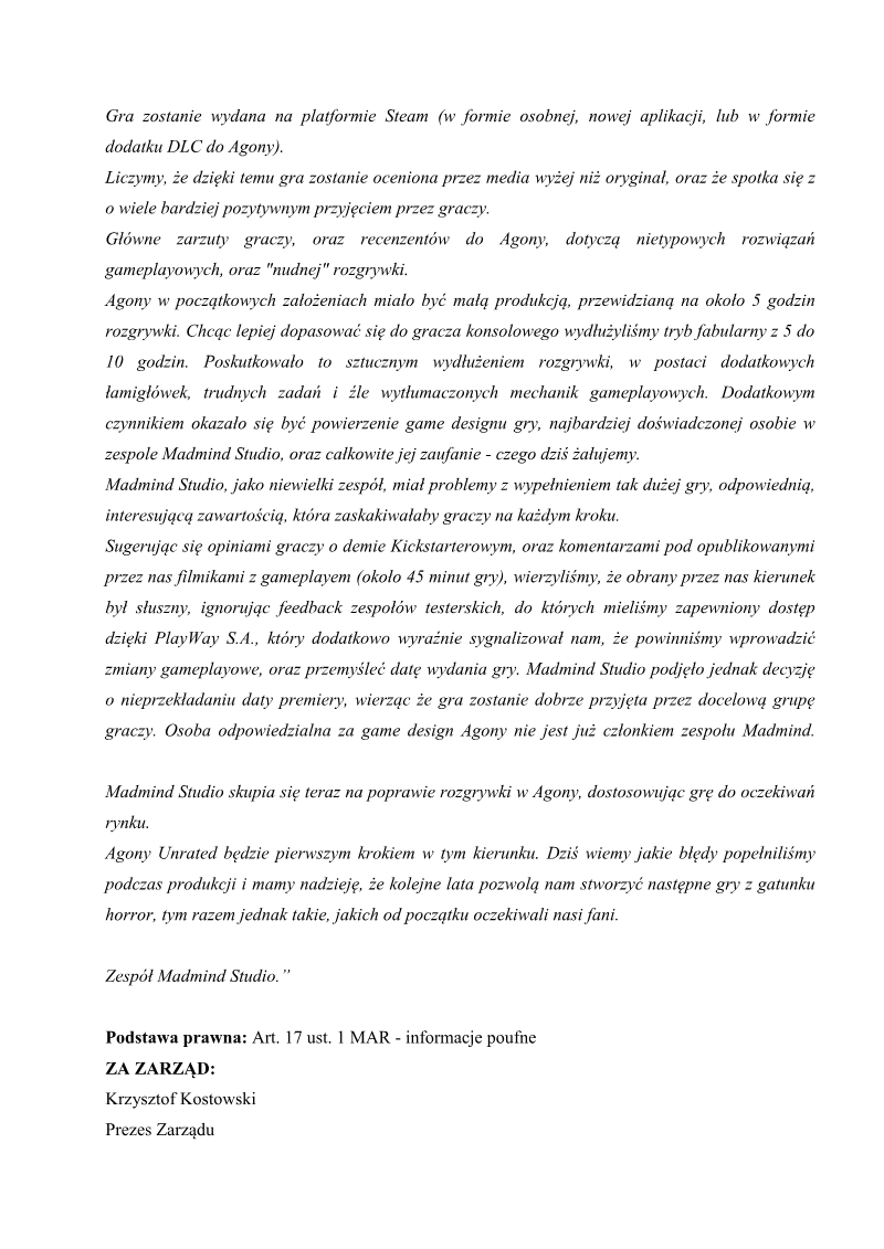 The management of PlayWay S.A. issued a formal communication regarding the performance and future strategy of its subsidiary, Madmind Studio, following the commercial and critical underperformance of the horror title Agony. Acknowledging that the game failed to meet the expectations of both investors and players upon its June 2018 release, the studio outlined a comprehensive recovery plan focused on technical stabilization and the release of a new, definitive version of the product.