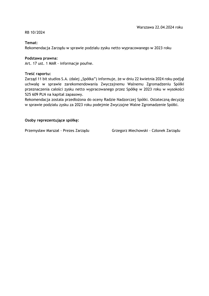The notification reports a transaction involving Grzegorz Miechowski, who holds the position of board member at 11 bit studios S.A. The filing is made under Article 19(1) of the MAR regulation, indicating a primary notification for a sale transaction. The issuer and market participant is 11 bit studios S.A., identified by LEI 259400KHTY4904KMKT70. The transaction concerns ordinary bearer shares of the issuer, classified as instrument PL11BTS00015. The sale was executed on 4 April 2023 at the Warsaw Stock Exchange (XWAR) in the equities market. A total of 2 000 shares were sold at a price of 635 PLN each, resulting in a gross transaction value of 1 270 000 PLN. The notification provides both detailed and aggregate information: the instrument description, transaction type (sale), price, volume, total volume, and transaction date. No additional transactions or changes are reported in this filing. The scope of the notification is limited to a single transaction on a specific date and venue, covering only ordinary shares of 11 bit studios S.A. The data are presented in compliance with MAR requirements, ensuring transparency for market participants and regulators regarding the sale by a senior executive.