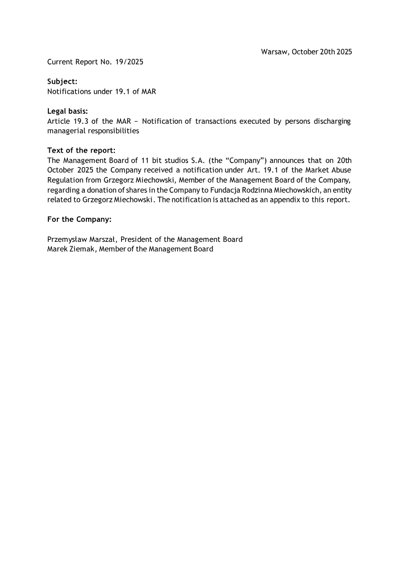The notice announces a postponement of the release date for 11 bit studios S.A.’s semi‑annual report covering the first half of 2024. The company, headquartered in Warsaw, originally scheduled publication for August 22, 2024, as stated in its current affairs report No. 1/2024 dated January 31, 2024. The new publication date is set for August 27, 2024. No other periodic reports will experience a change in their scheduled release dates. The communication is issued under Article 56(1)(2) of the Polish Act on Offer, which governs current and periodic information disclosures. The notice is signed by Przemysław Marszał, Chairman of the Board, and Grzegorz Miechowski, a board member. The announcement serves to inform shareholders, regulators, and the public of the adjusted timeline for accessing the company’s financial performance data for the first half of 2024.