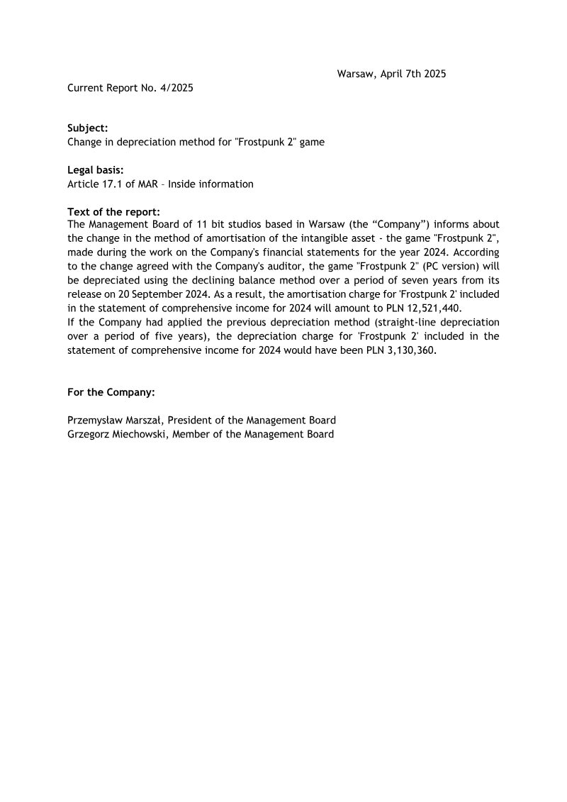 The Management Board of 11 bit studios has disclosed significant non-cash asset impairments and adjustments to its incentive program reserves as part of its financial closing for the 2024 fiscal year. These adjustments reflect a strategic reassessment of the company’s development pipeline and the commercial performance of specific titles within its portfolio. The most substantial impact stems from the formal discontinuation of the video game development codenamed Project 8, which resulted in a final impairment loss of PLN 49,057,019. This figure is categorized under costs of discontinued projects within the 2024 Statement of Comprehensive Income.