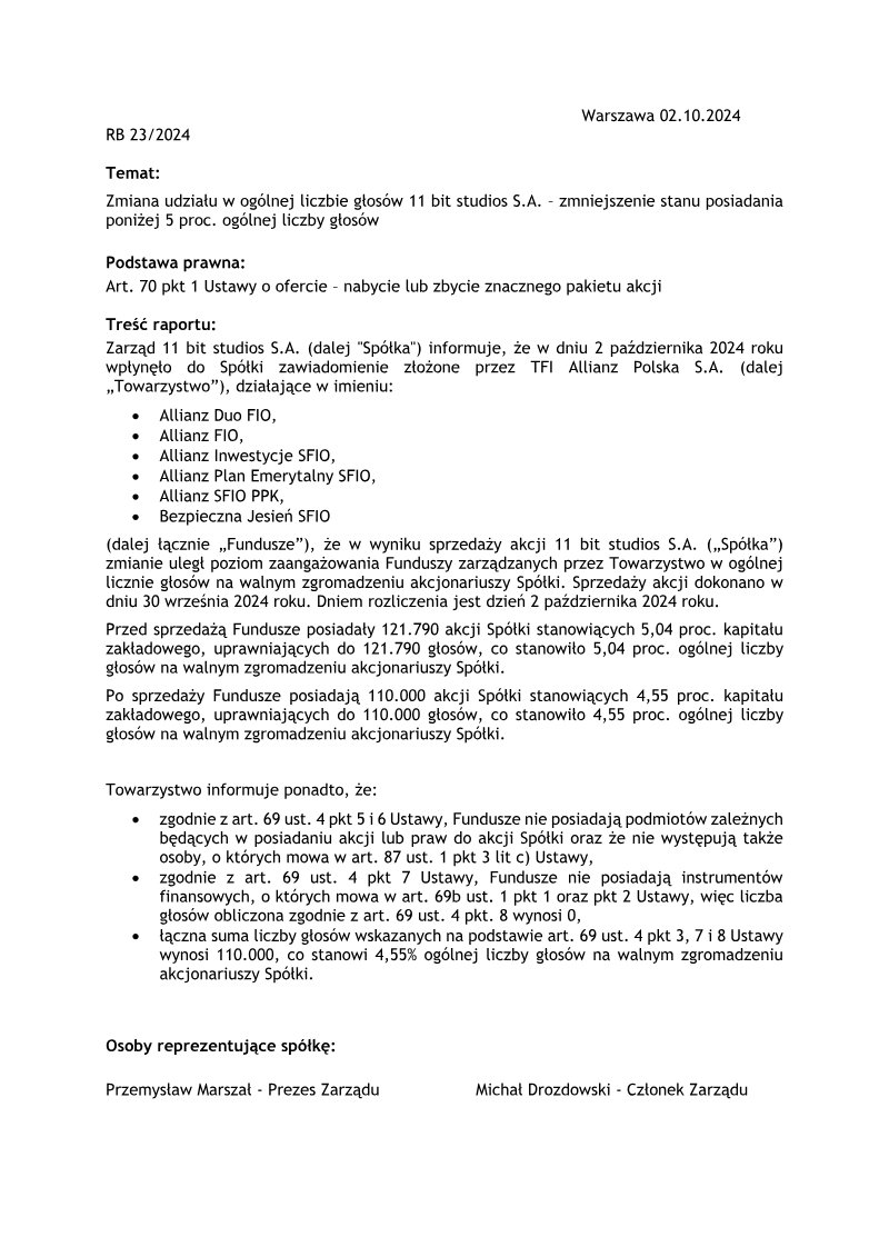 TFI Allianz Polska S.A. has reduced its investment stake in the Polish game developer 11 bit studios S.A., crossing below the significant threshold of 5 percent of total voting rights. This regulatory disclosure, issued in October 2024, details a divestment executed on September 30, 2024, and settled on October 2, 2024. The transaction involved several funds managed by the institution, including Allianz Duo FIO, Allianz FIO, and various specialized investment and pension funds.
