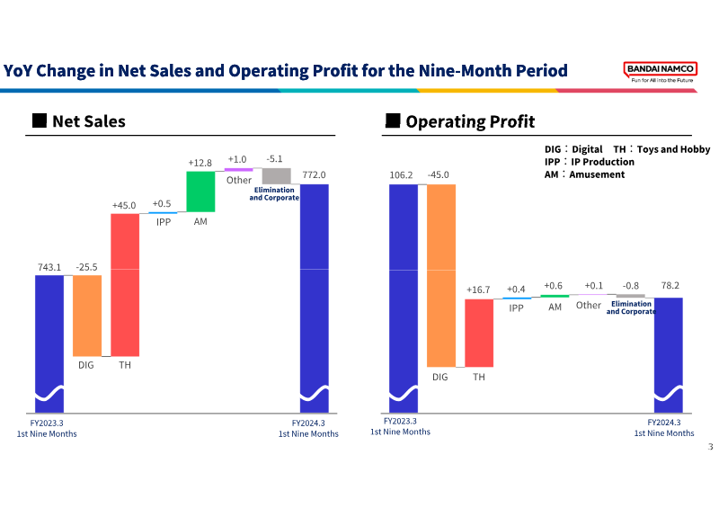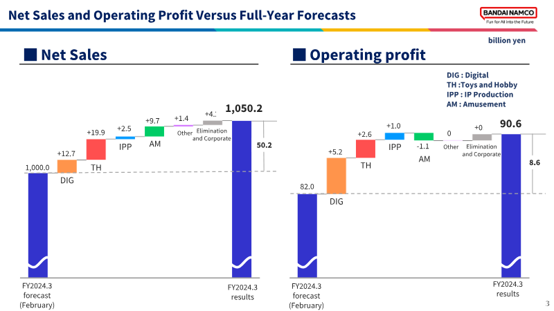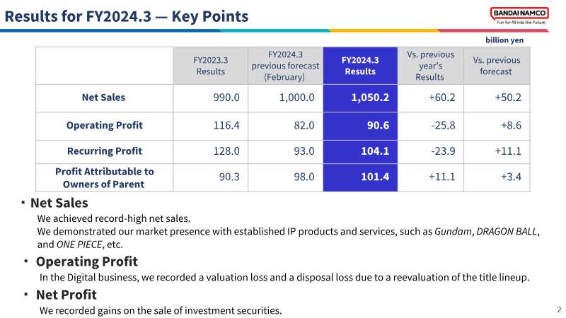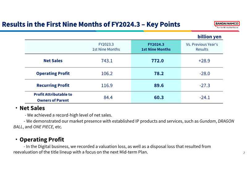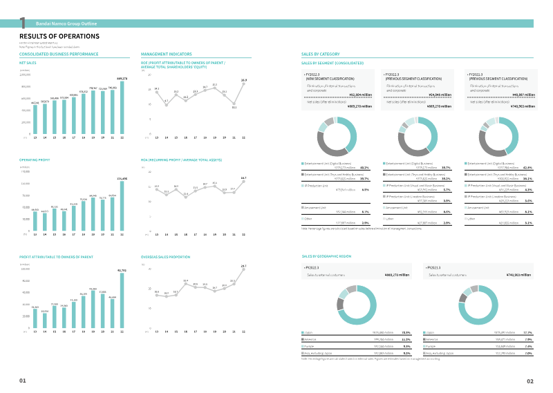 Bandai Namco’s 2021 integrated report presents the group’s strategic pivot around an “IP‑axis” model that leverages flagship properties such as Mobile Suit Gundam to drive growth across toys, digital entertainment, and amusement. The strategy, underpinned by ¥25.5 billion of cumulative investment (FY 2019‑2021) and FY 2021 R&D and marketing outlays of ¥82 billion and ¥45.2 billion respectively, enabled the launch of more than 300 IP‑based products worldwide and delivered record‑high net sales of ¥740.9 billion and operating profit of ¥84.6 billion, marking the seventh consecutive year of revenue expansion despite pandemic‑related disruptions that shaved roughly ¥75 billion from sales and ¥21 billion from profit.