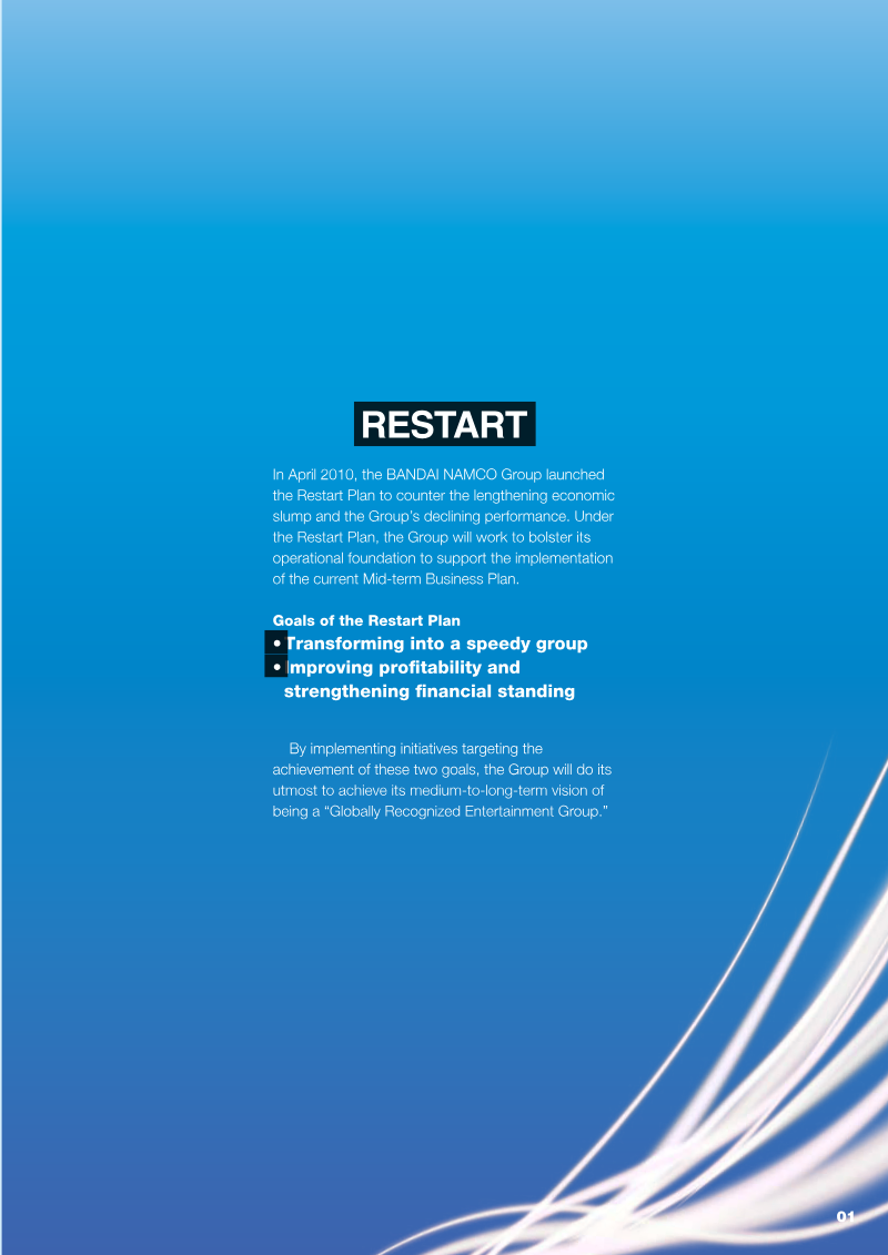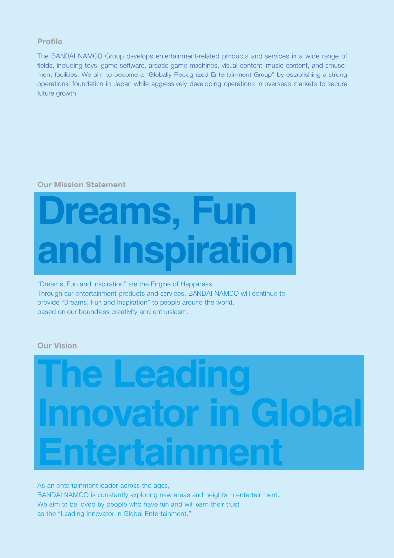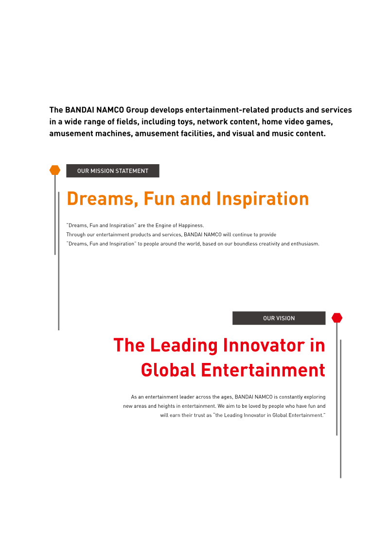 OUR MISSION STATEMENT OUR VISION “Dreams, Fun and Inspiration” are the Engine of Happiness. Through our entertainment products and services, BANDAI NAMCO will continue to provide “Dreams, Fun and Inspiration” to people around the world, based on our boundless creativity and enthusiasm. As an entertainment leader across the ages, BANDAI NAMCO is constantly exploring new areas and heights in entertainment.