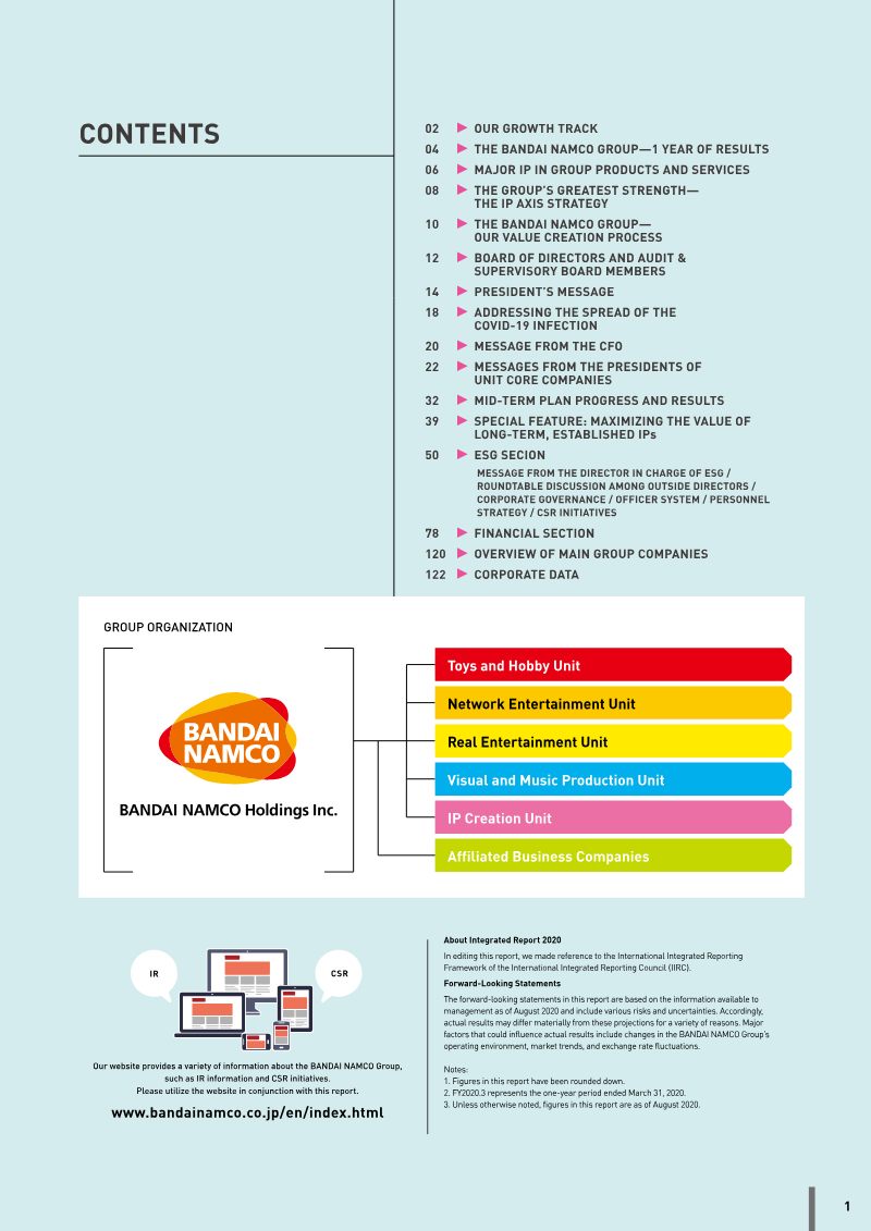 01 Consolidated Business Performance / 03 Sales by IPs / Toys and Hobby Unit 05 Network Entertainment Unit 06 Real Entertainment Unit / Visual and Music Production Unit / IP Creation Unit 08 Plastic Model Market / Figure Market / Capsule Toy Market / Card Product Market 09 Candy Toy Market / Children’s Lifestyle (Sundries) Market / Babies’ / Children’s Clothing Market Top Publishers in the Global App Market BANDAI NAMCO Group 10 Home Video Game Market 10 Amusement Machine Market /...