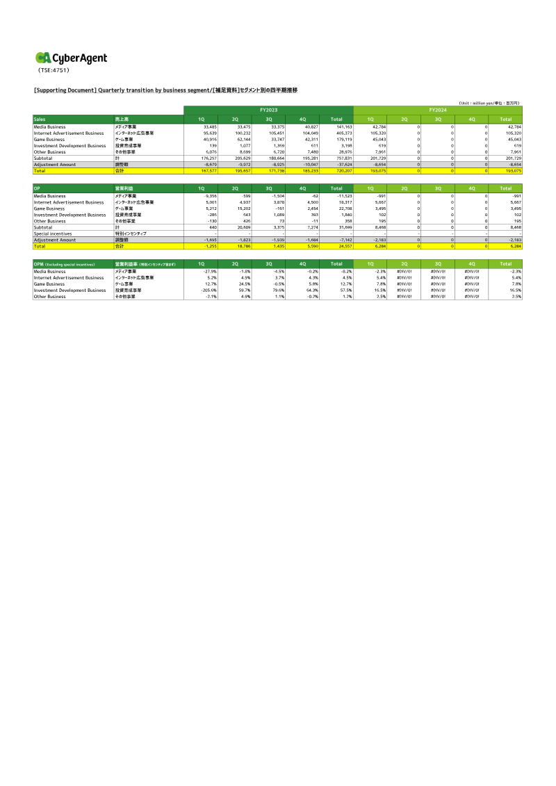 The quarterly transition data for FY2025 and FY2026 outlines revenue, operating profit, and operating margin trends across four business segments: Media & IP, Internet Advertisement, Game, and Investment Development. In FY2025, total sales reached 874 million yen, with the Game segment contributing the largest share at 216.7 million yen (24.9% of total). Operating profit totaled 71.7 million yen, driven primarily by the Game segment’s 60.8 million yen profit (84.7% of total). The Investment Development segment recorded a loss of 1.5 million yen, reflecting significant volatility. For FY2026, sales dropped to 232 million yen, with the Media & IP segment accounting for 62.6 million yen (27% of total). Operating profit fell to 23.4 million yen, largely due to the Media & IP segment’s modest 4.9 million yen profit and a loss of 552 k yen in Investment Development. The Game segment’s contribution was absent, indicating a zero‑sales quarter for this period. Operating margin analysis shows the Game segment maintained high profitability in FY2025, with margins peaking at 33.5% in Q4 and an average of 27.3%. In FY2026, margins declined sharply across all segments; Media & IP fell to 2.0% in Q4, Internet Advertisement to 3.0%, and Investment Development suffered a severe negative margin of –285.5% in Q4, averaging –264.0% for the year. Methodologically, figures are presented in million yen units, with quarterly breakdowns and adjustments noted. The data covers Japanese domestic operations for the fiscal years 2025 and 2026, focusing on revenue generation, profitability, and margin performance across the company’s core business lines.