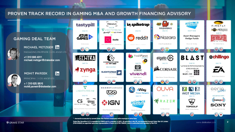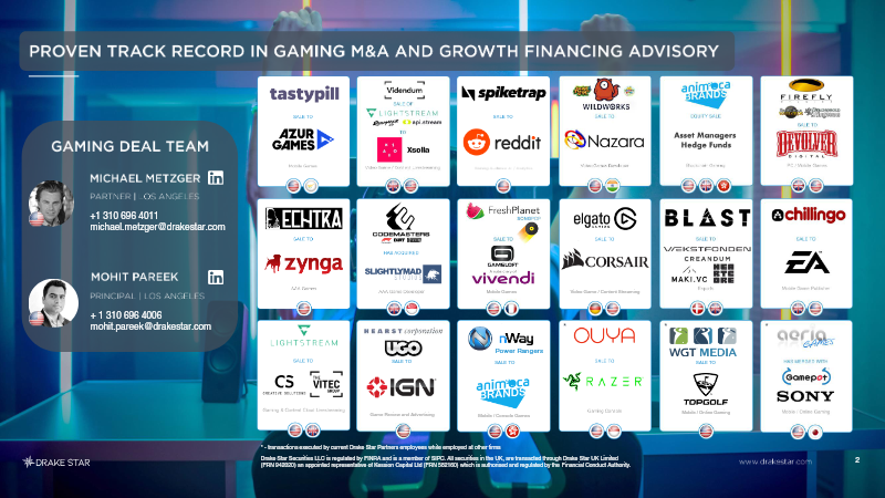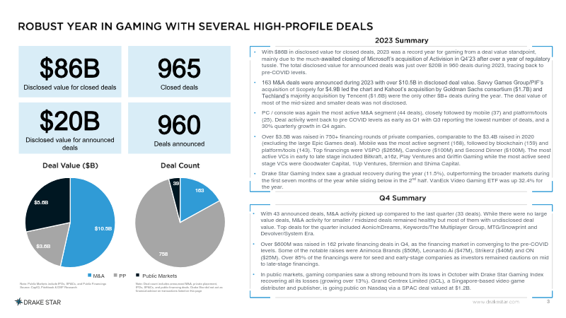 The geographic scope of the analysis is global, with significant data points covering North America, Europe, and Asian markets, particularly Japan, Korea, and China. Public market performance showed a gradual recovery, with the Drake Star Gaming Index rising 11.5% over the year.