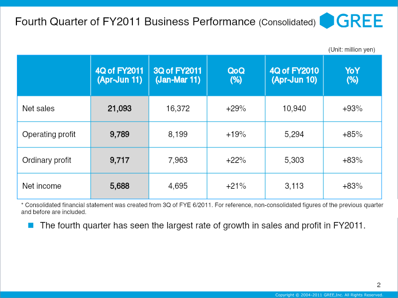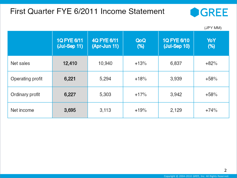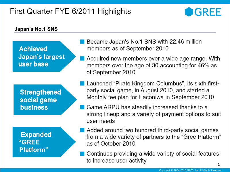 This financial report details the performance of GREE, Inc. for the first quarter of the fiscal year ending June 30, 2011, covering the period from July to September 2010. The primary thesis highlights GREE’s emergence as Japan’s leading social networking service (SNS) and its successful transition into a robust social gaming platform. By September 2010, the service reached 22.46 million members, demonstrating a broad demographic appeal with 46% of users aged 30 or older.