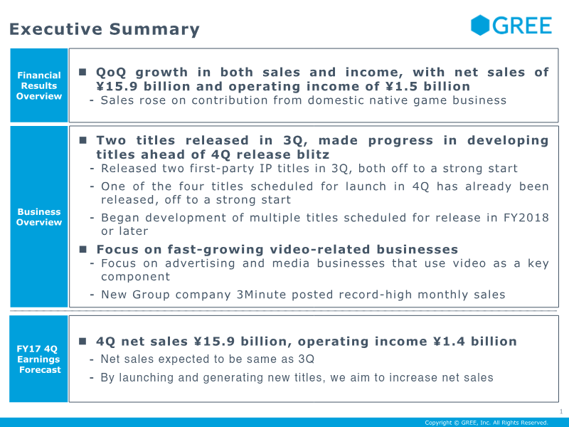 GREE, Inc. reported its fiscal year 2017 fourth-quarter results, highlighting a successful turnaround of its game business and a strategic shift toward global distribution. For the full year, the company achieved net sales of ¥65.4 billion and an operating income of ¥8 billion. The fourth quarter saw quarter-on-quarter growth with ¥19.2 billion in net sales and ¥2.4 billion in operating income, driven by the successful launch of four native games—including Another Eden and SINoALICE—all of which reached the top 20 rankings.
