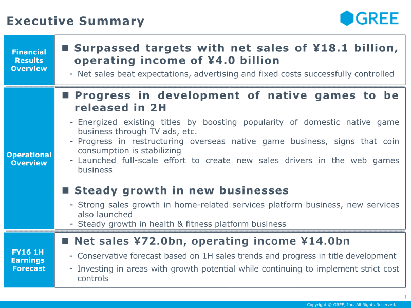 Looking ahead, the first-half earnings forecast has been revised upward to ¥37.0 billion in net sales and ¥7.0 billion in operating income. The pipeline remains robust with 14 titles in development, including high-profile projects like memories of the Blue and various IP-based titles scheduled for winter 2015. Additionally, new business ventures in home-related services and health and fitness platforms, such as Renoco and Lespas, demonstrated steady expansion. These results cover GREE’s global operations across Japan, North America, and South Korea for the three-month period ending September 30, 2015.