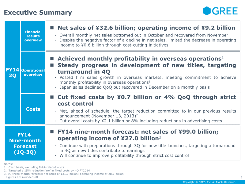 GREE’s financial results for the first quarter of fiscal year 2016 reflect a strategic shift toward profitability through rigorous cost management and the stabilization of its native game portfolio. The company achieved an operating income of ¥4.4 billion, representing quarter-on-quarter growth despite a slight decline in net sales to ¥19.3 billion. This performance was driven by a ¥1.8 billion reduction in total costs, achieved through lower advertising spend, reduced server leasing fees, and a streamlined consolidated headcount, which fell from 1,634 to 1,475 employees.