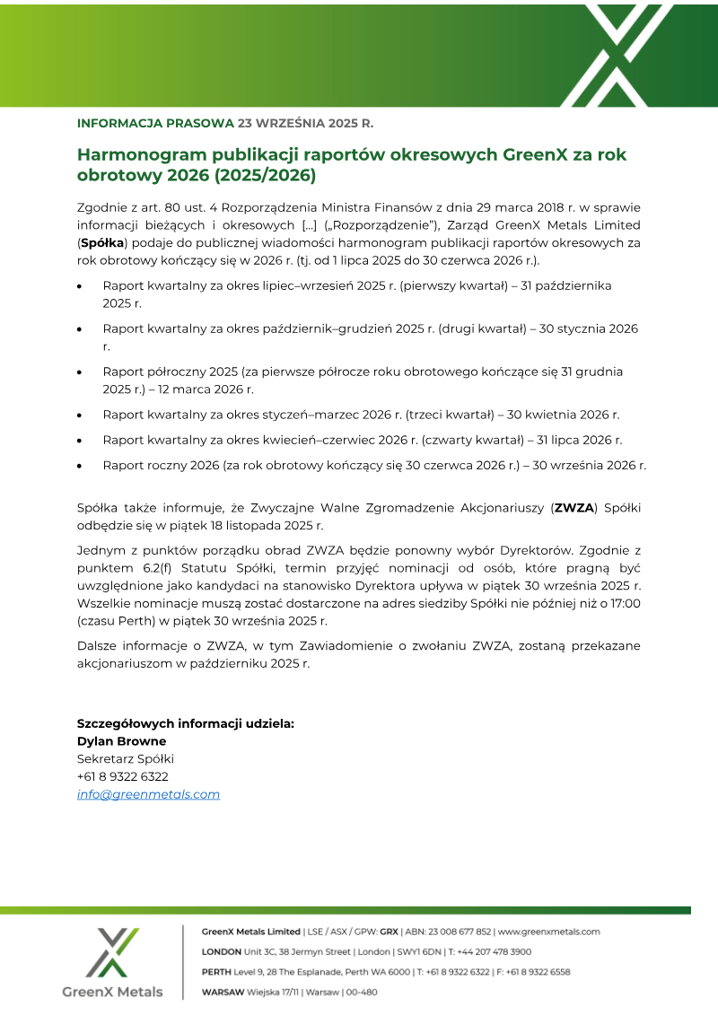 GreenX Metals Limited has established its formal schedule for the publication of periodic financial reports for the 2026 fiscal year, spanning from July 1, 2025, to June 30, 2026. This disclosure adheres to regulatory requirements concerning the transparency of current and periodic information for publicly traded entities. The schedule ensures that stakeholders receive consistent updates on the company’s financial performance throughout the fiscal cycle, maintaining compliance with international reporting standards across the London Stock Exchange, the Australian Securities Exchange, and the Warsaw Stock Exchange.