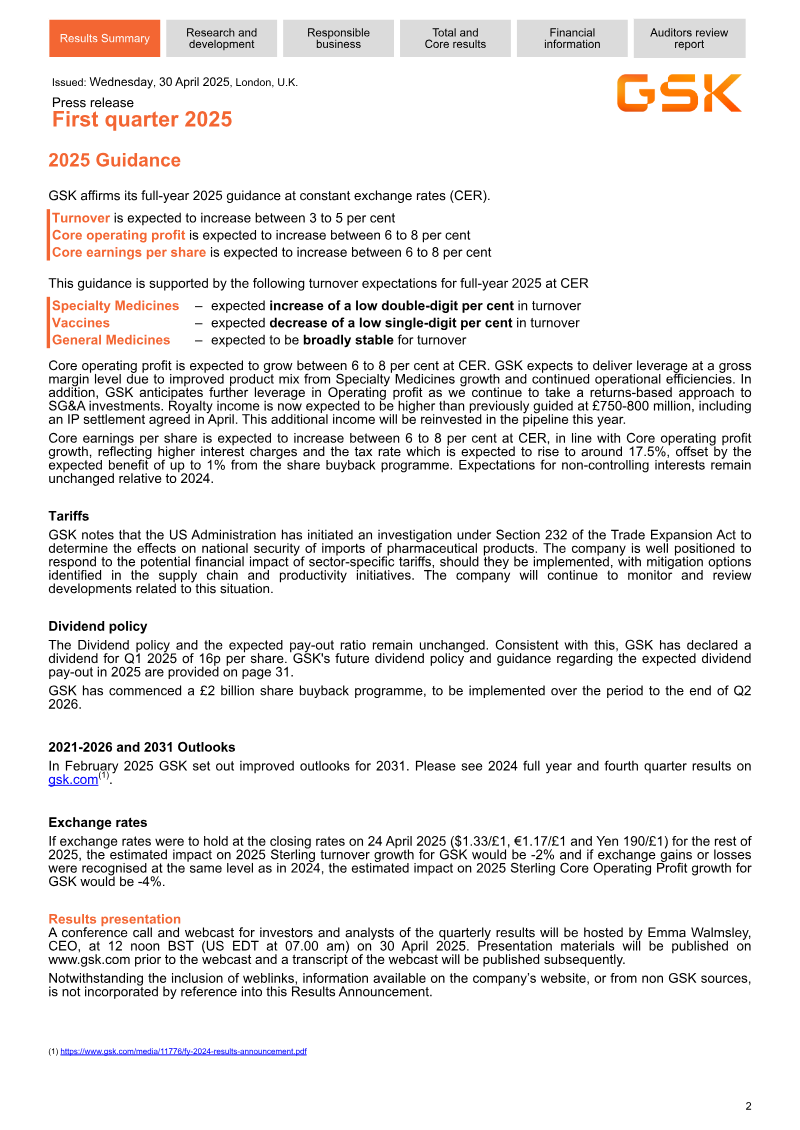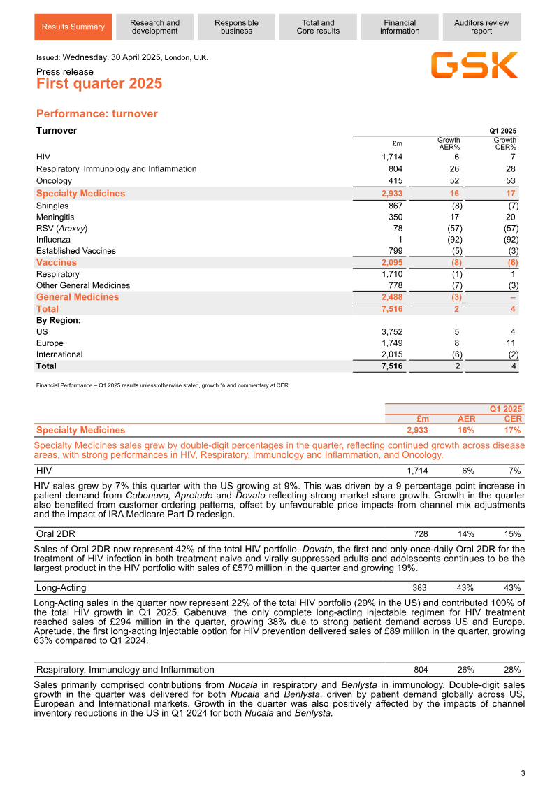 Issued: Wednesday,30 April 2025, London, U.K. GSK makes strong start to 2025 with growth in sales, profits and earnings Specialty Medicines growth drives Q1 performance • Total Q1 sales £7.5 billion +2% AER; +4% CER • Specialty Medicines sales £2.9 billion (+17%); Respiratory, Immunology and Inflammation £0.8 billion (+28%); Oncology £0.4 billion (+53%); HIV sales £1.7 billion (+7%) • Vaccines sales £2.1 billion (-6%); Shingrix £0.9 billion (-7%); Meningitis vaccines £0.4 billion (+2...