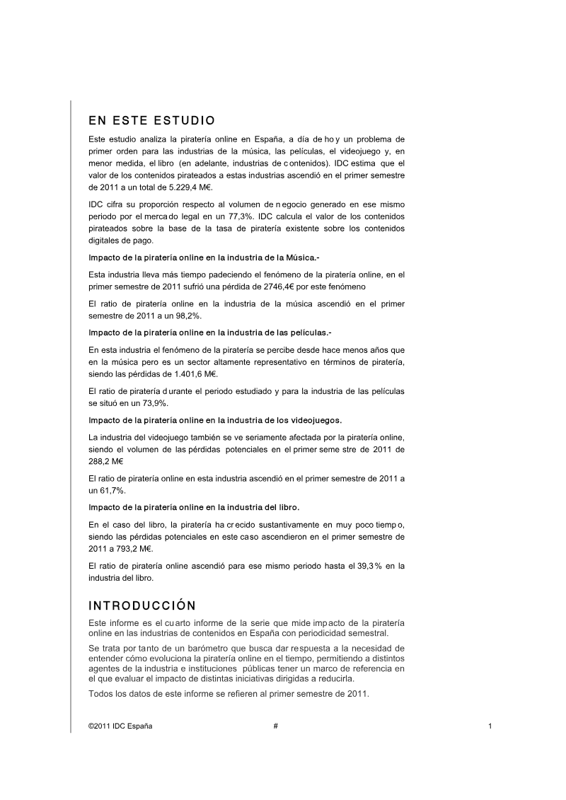 The study quantifies the scale of digital‑content piracy in Spain during the first half of 2011 and demonstrates that illicit consumption far exceeds legitimate market activity. Pirated material was valued at €5.23 billion, representing roughly 77 % of the legal turnover of €1.54 billion and approaching four times the revenue generated by lawful sales. The incidence of piracy varies markedly across sectors: music reaches a 98.2 % piracy rate amounting to €2.75 billion, films register 73.9 % (€1.40 billion), and video games show 61.7 % of their market value being pirated, with books trailing behind the other categories.