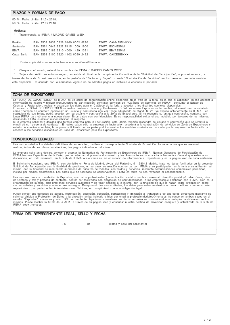 The scope covers the Spanish market, with the fair taking place in October 2018 at IFEMA’s Madrid venue, and targets companies operating in the video‑games development and publishing sectors. The procedural framework requires completion of the online application, submission of payment proof to [email protected], and acceptance of IFEMA’s General and Specific Participation Rules, as well as its data‑protection policy, which permits limited sharing of exhibitor contact details with IFEMA’s service partners under confidentiality obligations.