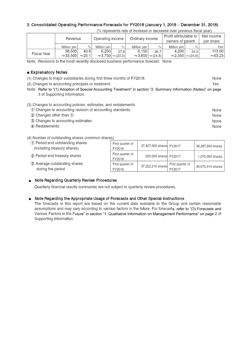 KLab Inc. reported a strong third‑quarter performance for fiscal year 2017, with consolidated revenue rising 25.0 % to ¥18,238 million compared to the same period in FY2016. Operating income surged 211.0 % to ¥3,206 million, and ordinary profit reached ¥3,767 million, resulting in a net income attributable to owners of parent of ¥2,588 million. The company’s comprehensive income for the quarter was ¥2,602 million, reversing a loss of ¥740 million in FY2016. Net assets increased to ¥11,922 million, up 24.4 % from the prior year, while the equity ratio improved to 69.6 %. Total assets grew to ¥17,098 million, driven largely by higher cash balances and intangible asset gains. The company forecast FY2017 revenue at ¥26,000 million, operating income at ¥4,300 million, ordinary income at ¥4,900 million, and profit attributable to owners of parent at ¥3,300 million. These forecasts reflect recent favorable trends and are presented as single‑figure estimates rather than ranges. KLab’s operating results were largely supported by the success of mobile titles such as “Bleach: Brave Souls,” “Captain Tsubasa ~ Tatakae Dream Team,” and “Utano Princesama Shining Live.” Cost of sales increased 10.4 % mainly due to higher royalties, while selling‑general‑administrative expenses rose 12.4 % from increased advertising spend. Non‑operating income benefited from a ¥512 million foreign exchange gain. Geographically, the report covers Japan‑based operations with no explicit international revenue breakdown. The period examined is January 1 to September 30, 2017, and the analysis relies on consolidated financial statements prepared under Japanese GAAP. No significant changes in accounting policies or restatements were noted for the period.