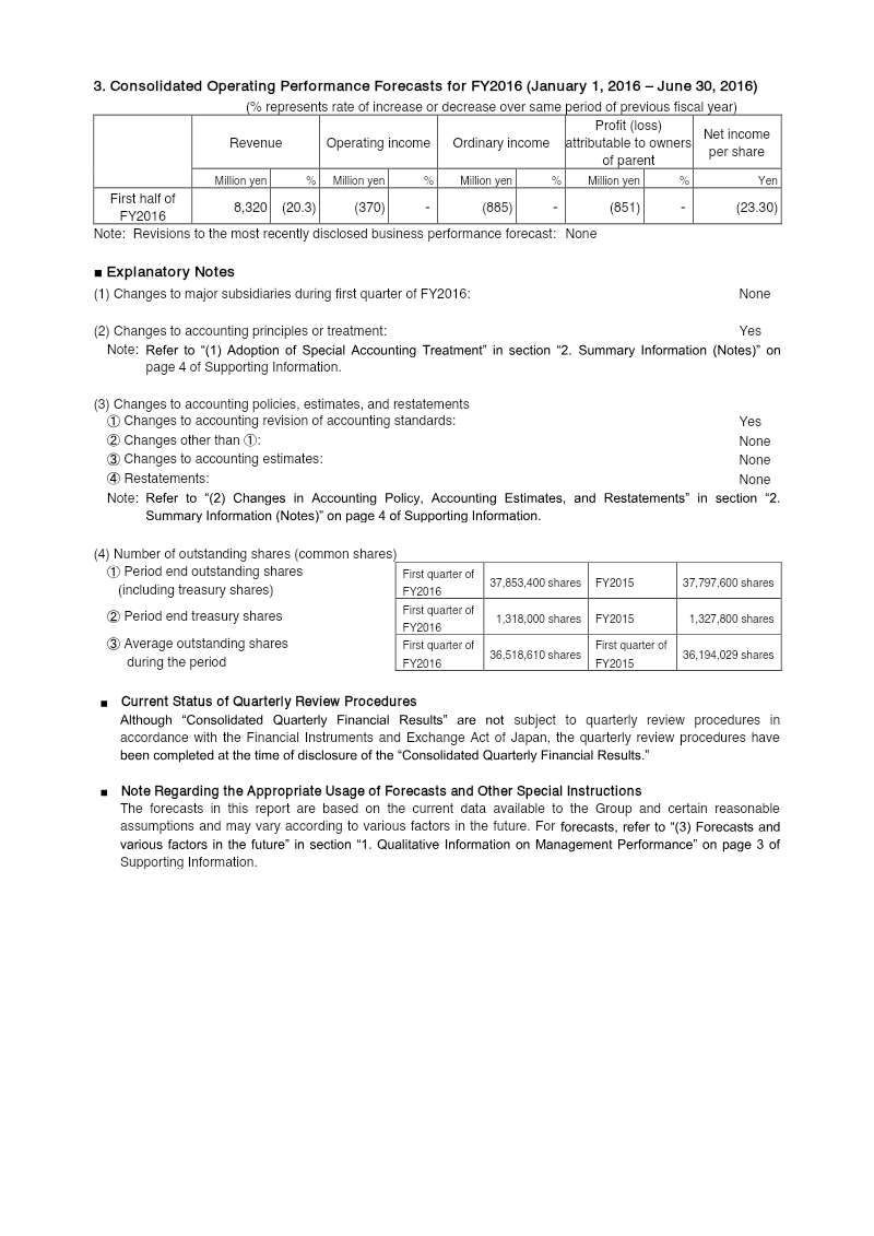 KLab Inc. reported first‑quarter fiscal 2017 results for the period January 1 to March 31, 2017. Consolidated revenue rose 8.9 % year‑over‑year to ¥5,249 million, driven by strong performance of “Love Live! School Idol Festival” and “Bleach: Brave Souls.” Operating income improved to ¥935 million from a loss of ¥70 million in the same quarter last year, and ordinary profit reached ¥1,056 million. Net income attributable to owners of parent was ¥689 million, a turnaround from the ¥414 million loss recorded in Q1 2016. Comprehensive income for the quarter was ¥737 million, reversing a ¥438 million loss in Q1 2016. Total assets increased to ¥13,119 million from ¥12,133 million year‑prior, with current assets up by ¥433 million largely due to higher trade receivables. Net assets grew to ¥9,880 million, reflecting a rise in retained earnings. The equity ratio remained stable at 75.1 %. Cash and deposits were ¥4,922 million, while accounts receivable stood at ¥2,440 million. Non‑current assets grew to ¥4,769 million, mainly from software in progress. The company issued a full‑year forecast for FY2017: revenue between ¥22,500 million and ¥17,500 million; operating income ranging from ¥2,900 million to ¥600 million; ordinary profit between ¥2,750 million and ¥450 million; and profit attributable to owners of parent from ¥1,750 million to ¥160 million. These ranges reflect uncertainty around new title launches and market conditions. No dividends were declared for FY2016 or FY2017, and the company maintained its dividend forecast at zero. The report covers Japan‑based operations under Japanese GAAP, with no significant changes in accounting policies or restatements noted.
