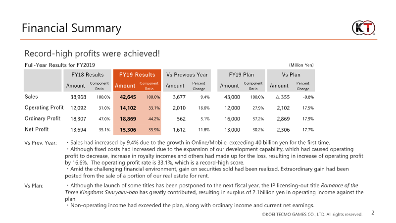 The fiscal year ending March 2020 saw KOEI TECMO HOLDINGS achieve record‑high profitability, with sales rising 9.4 % to ¥42.6 billion and operating profit increasing 16.6 % to ¥14.1 billion, a 33.1 % operating margin that tops the company’s historical peak. Net profit climbed 11.8 % to ¥15.3 billion, supported by gains on securities and real‑estate sales, offsetting higher fixed costs from expanded development capacity. The company’s earnings plan for FY 2019 was surpassed, largely due to the licensing‑out success of “Romance of the Three Kingdoms Senryaku‑ban,” which generated substantial royalty income, and strong performance in new console titles such as Nioh 2. Geographically, overseas sales grew 27.1 % to ¥15.8 billion, with Asia contributing the largest share of growth (52 % increase in unit sales). Digital downloads and DLCs also expanded, with console download sales up 39.6 % to ¥7.9 billion and DLC revenue rising 35.2 %. The entertainment segment’s online/mobile division drove a 42.4 % jump in mobile and social game revenue, reflecting successful IP licensing and self‑developed titles. Operationally, headcount rose 4.4 % to 1,835 employees, and capital expenditures reached ¥14.3 billion for the new Minato‑Mirai office and music hall. Management emphasized cautious earnings guidance for FY 2020 amid COVID‑19 uncertainty, while outlining a mid‑term strategy focused on global IP creation, multi‑platform expansion, and ESG commitments. Dividend policy maintained a 50 % payout ratio, with FY 2019 dividends planned at ¥61 per share.