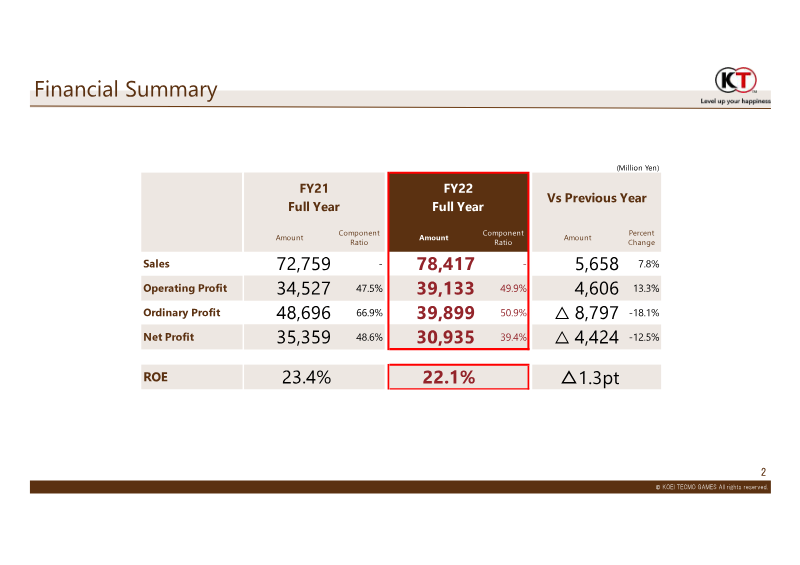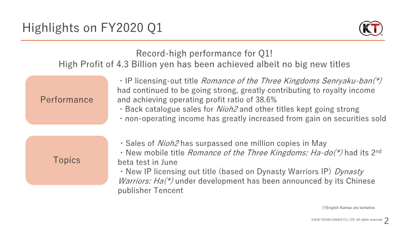 Koei Tecmo Holdings reported record-high financial performance for the first quarter of the fiscal year ending March 2021, characterized by significant growth in profitability despite a lack of major new title launches. Net sales reached 11.36 billion yen, a 57.2% increase year-over-year, while operating profit surged by 358.6% to 4.38 billion yen. This performance was primarily driven by high-margin royalty income from the IP licensing-out title Romance of the Three Kingdoms Senryaku-ban in China and robust back-catalogue sales for Nioh 2, which surpassed one million total units sold during the period.