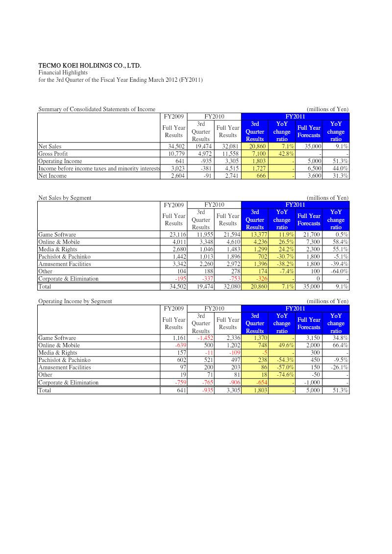 Koei Tecmo Holdings reported a strong third‑quarter performance for fiscal year 2015, with net sales rising to ¥37.8 billion from ¥24.1 billion in the same period of FY2014, a 6.4% increase that exceeded the ¥40 billion forecast by 5.8%. Gross profit grew to ¥17.1 billion, up 7.6% from the prior year’s quarter, while operating income surged to ¥9.65 billion, a 19% rise that still fell short of the ¥10 billion target by 3.6%. Net income reached ¥9.43 billion, up 4.6% year‑on‑year and slightly below the ¥9.5 billion forecast.