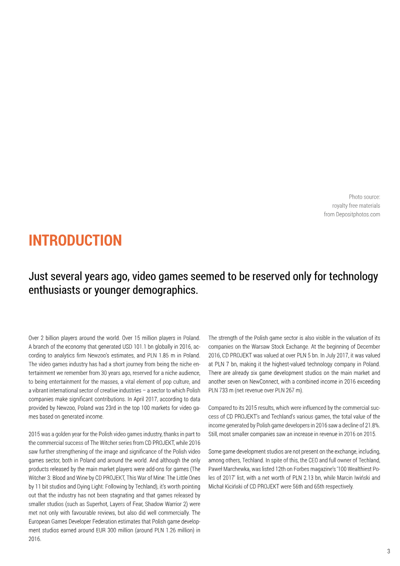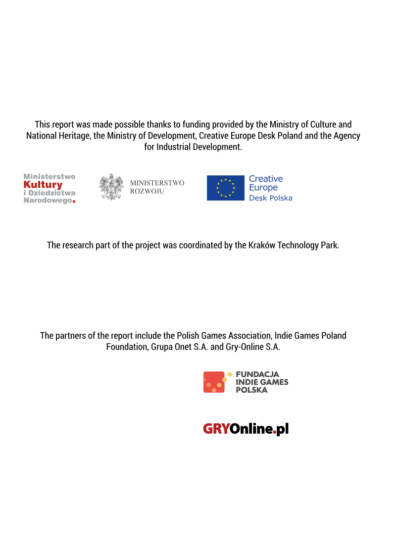 This report was made possible thanks to funding provided by the Ministry of Culture and National Heritage, the Ministry of Development, Creative Europe Desk Poland and the Agency The research part of the project was coordinated by the Kraków Technology Park. The partners of the report include the Polish Games Association, Indie Games Poland Foundation, Grupa Onet S.A. and Gry-Online S.A.