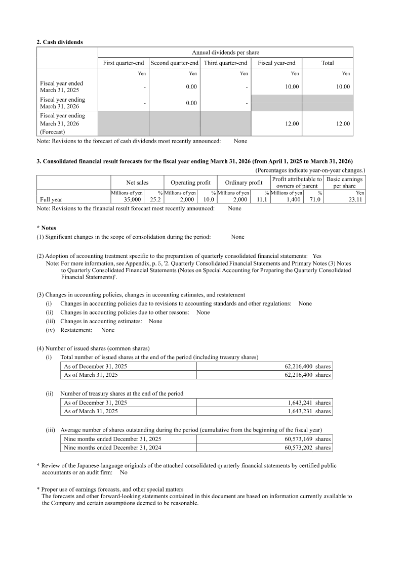 Cash dividends were declared at ¥10.00 per share for the third quarter, with a forecast of ¥12.00 per share for the fiscal year ending March 31 2026; no revisions to dividend or earnings forecasts were announced. The company’s operating segments—Digital Amusement, Audio & Visual Business, and Visual Total Income—contributed ¥29,121 million in sales, with segment profits of ¥1,776 million after corporate expense adjustments.