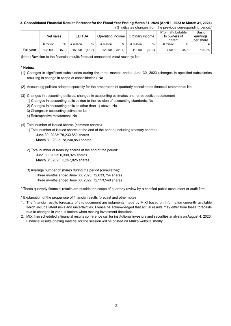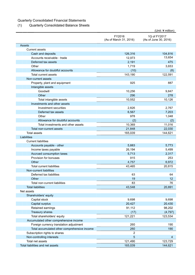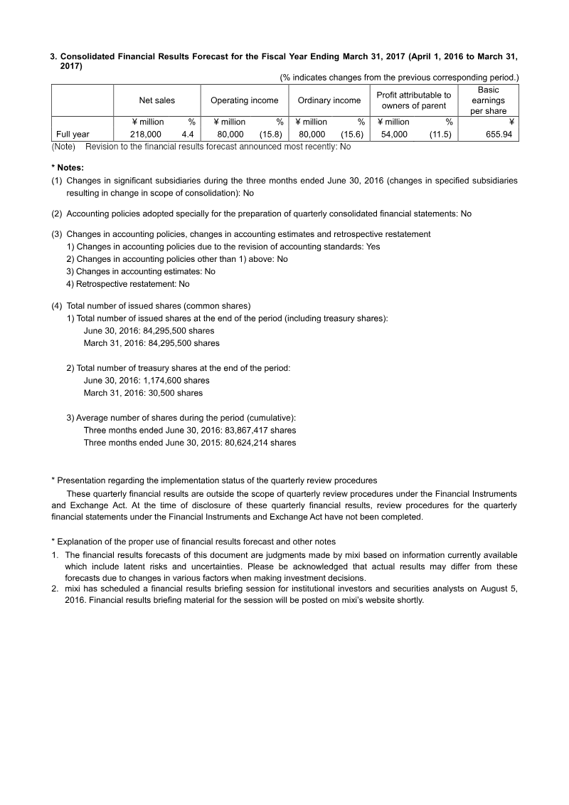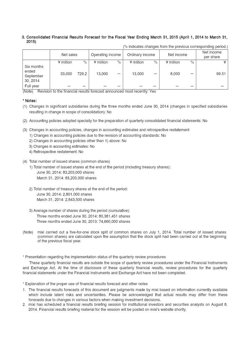 The quarterly filing presents mixi, Inc.’s consolidated financial results for the three months ended June 30, 2014, covering April 1 to June 30. Net sales surged 493 % from ¥2,144 million in the same period a year earlier to ¥12,718 million, driven by growth in media and content and life events segments. Operating income turned positive at ¥4,654 million versus a loss of ¥84 million in 2013, and ordinary income rose to ¥4,636 million. Net income reached ¥2,919 million, translating into earnings per share of ¥36.32 and diluted earnings per share of ¥36.27, a stark reversal from the prior year’s loss. Total assets increased to ¥31,594 million, with net assets at ¥25,128 million and an equity ratio of 79.4 %. Cash and cash equivalents grew from ¥16,818 million to ¥20,407 million, supported by operating cash flow of ¥2,918 million. The company completed a five‑for‑one stock split on July 1, 2014; all per‑share figures are adjusted as if the split had occurred at fiscal year start. Segment analysis shows media & content and life events businesses as primary revenue drivers, with a company‑wide expense adjustment of ¥479 million. No significant changes in consolidation scope or accounting estimates were reported. Dividend policy remains undecided for the fiscal year ending March 31, 2015, and a financial results briefing is scheduled for August 8, 2014.