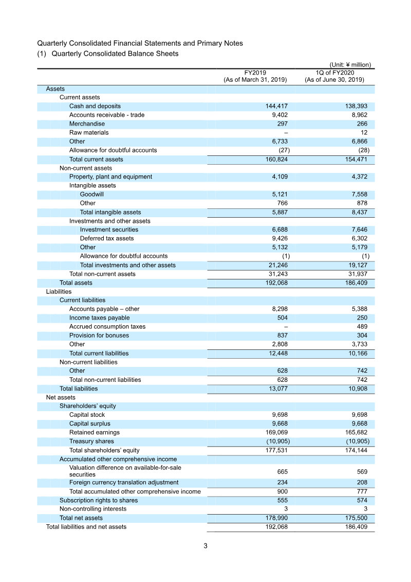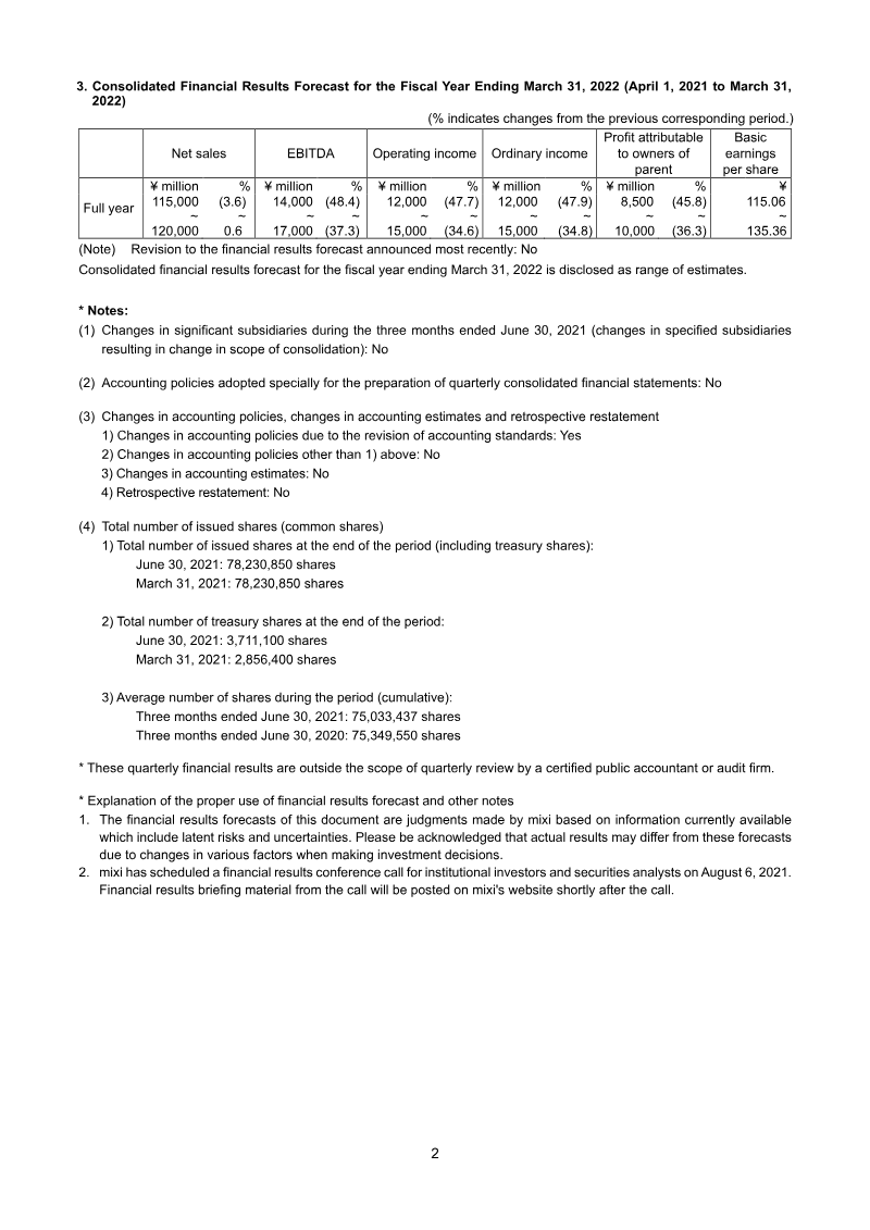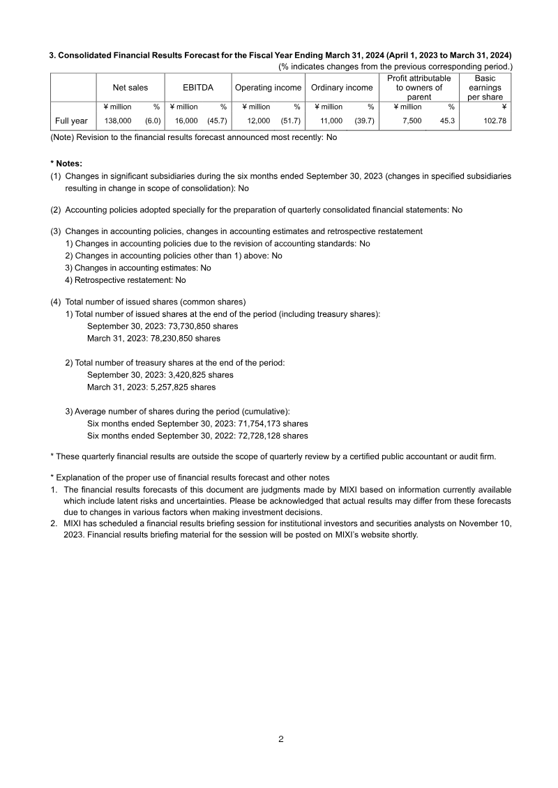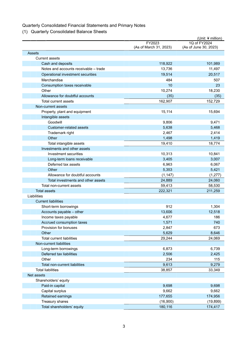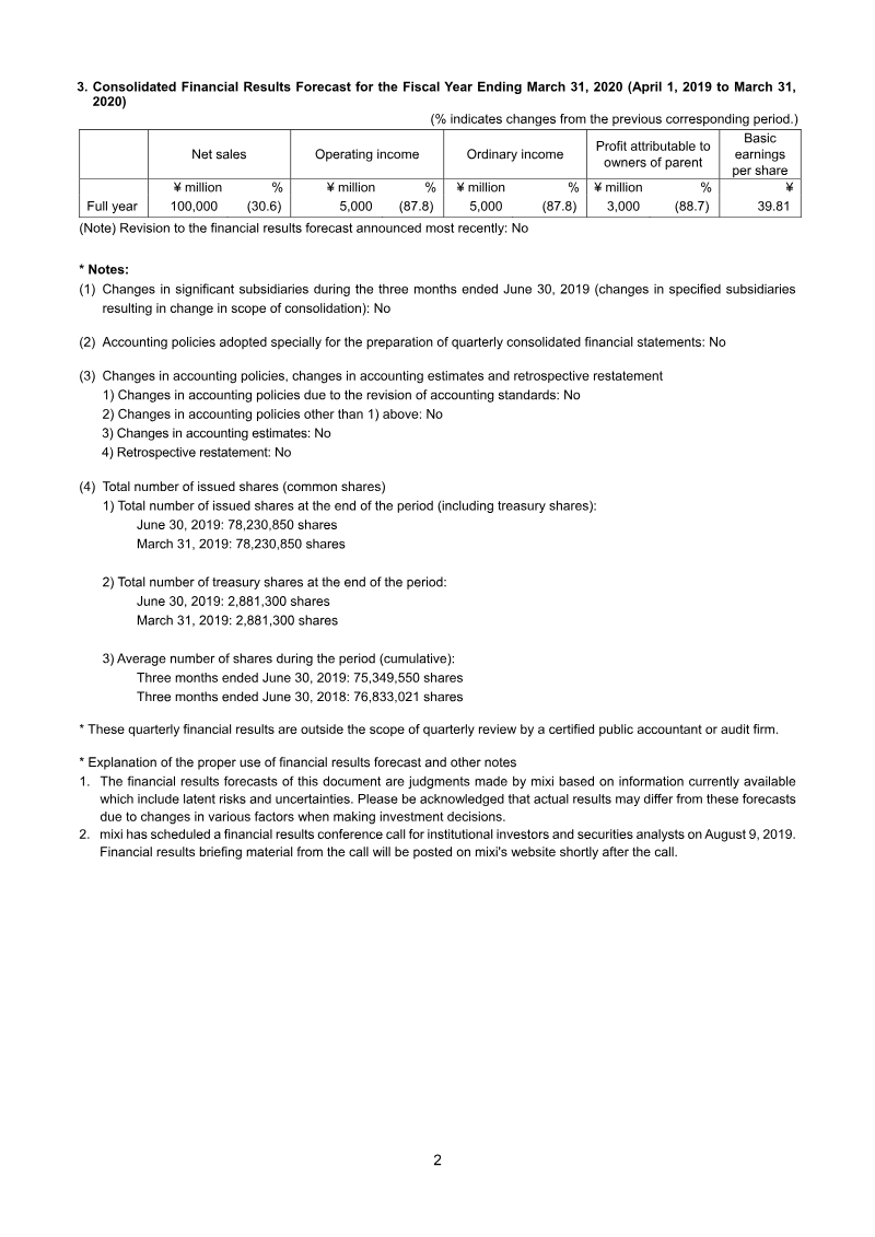 The quarterly filing presents mixi, Inc.’s consolidated financial results for the three months ended June 30, 2014, covering April 1 to June 30. Net sales surged 493 % from ¥2,144 million in the same period a year earlier to ¥12,718 million, driven by growth in media and content and life events segments. Operating income turned positive at ¥4,654 million versus a loss of ¥84 million in 2013, and ordinary income rose to ¥4,636 million. Net income reached ¥2,919 million, translating into earnings per share of ¥36.32 and diluted earnings per share of ¥36.27, a stark reversal from the prior year’s loss. Total assets increased to ¥31,594 million, with net assets at ¥25,128 million and an equity ratio of 79.4 %. Cash and cash equivalents grew from ¥16,818 million to ¥20,407 million, supported by operating cash flow of ¥2,918 million. The company completed a five‑for‑one stock split on July 1, 2014; all per‑share figures are adjusted as if the split had occurred at fiscal year start. Segment analysis shows media & content and life events businesses as primary revenue drivers, with a company‑wide expense adjustment of ¥479 million. No significant changes in consolidation scope or accounting estimates were reported. Dividend policy remains undecided for the fiscal year ending March 31, 2015, and a financial results briefing is scheduled for August 8, 2014.