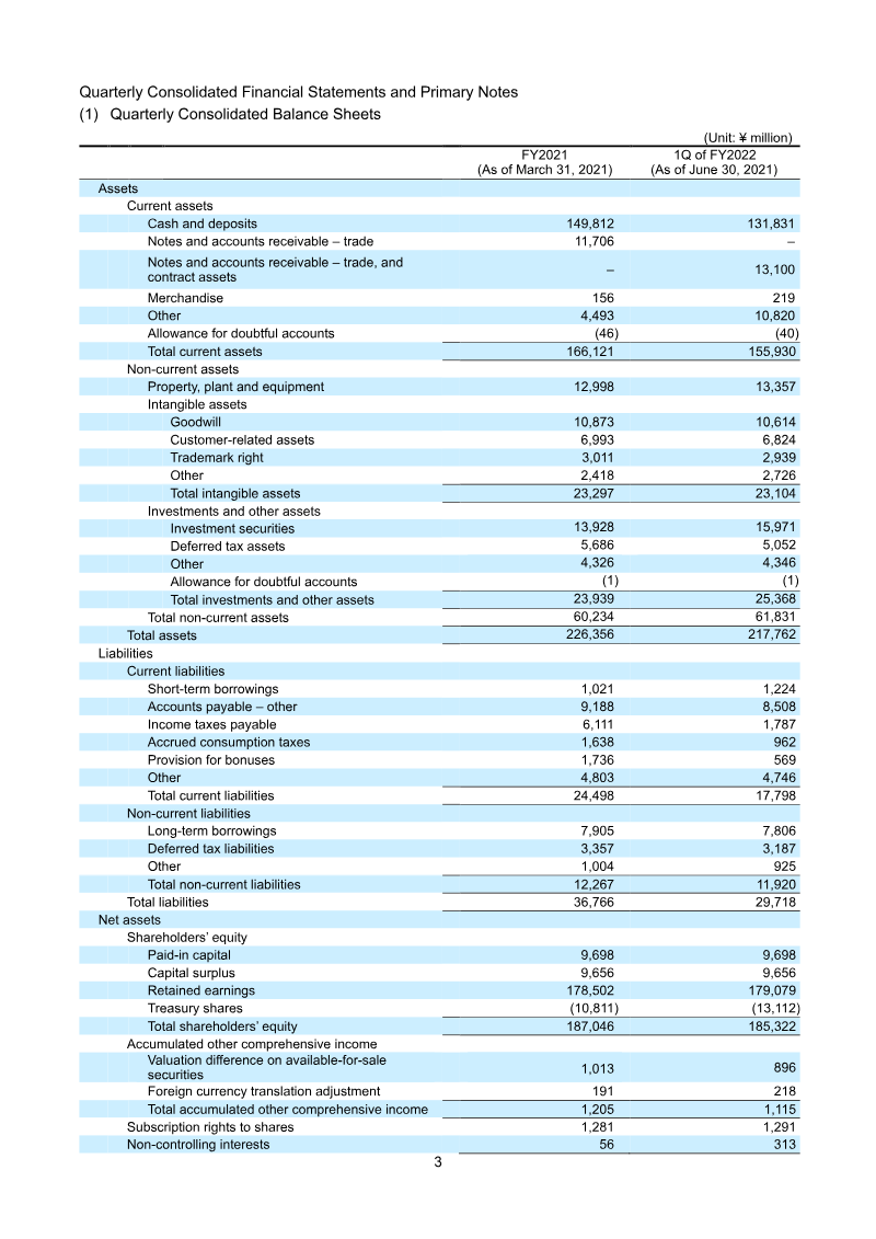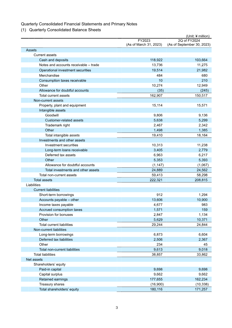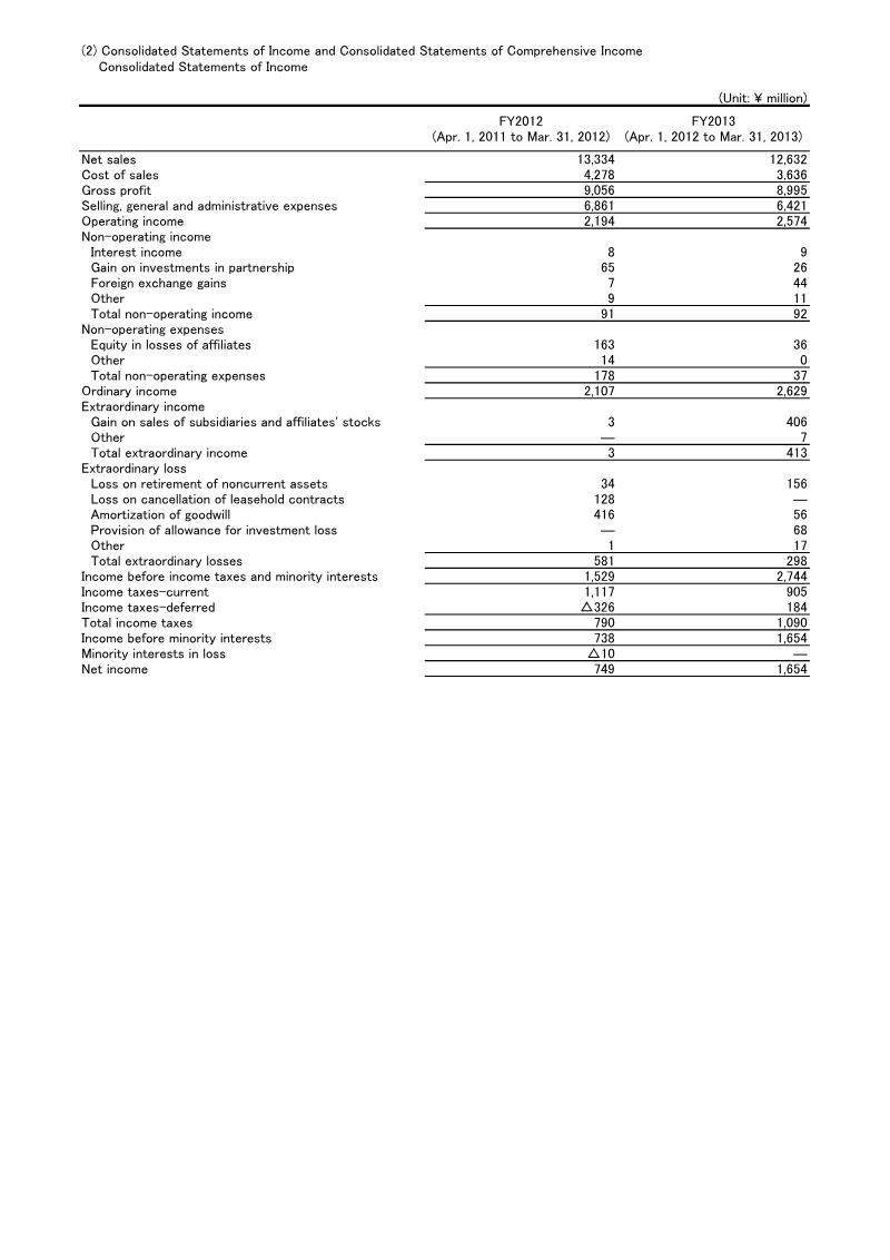 The quarterly consolidated balance sheets and accompanying income statements present a snapshot of the company’s financial position at the end of FY2012 Q2, compared with FY2011 Q2. Total assets increased modestly from ¥19,649 million to ¥19,876 million, driven primarily by a rise in current assets—cash and deposits grew from ¥10,423 to ¥12,450 million while accounts receivable fell. Non‑current assets declined slightly as property, plant and equipment net values decreased from ¥1,258 to ¥1,084 million. Shareholders’ equity rose from ¥14,704 to ¥15,771 million, largely due to an increase in retained earnings and a reduction in treasury stock. Operating performance improved markedly. Net sales grew from ¥6,081 to ¥6,817 million, and gross profit increased from ¥4,043 to ¥4,849 million. Operating income more than doubled from ¥850 to ¥1,612 million, reflecting tighter cost control and higher sales. Net income surged from ¥340 to ¥1,205 million, with extraordinary gains on subsidiary stock sales contributing ¥406 million in Q2 FY2012. Foreign exchange losses rose, but were offset by gains on investments and reduced equity losses of affiliates. Cash flow analysis shows a turnaround in operating cash generation, moving from a net outflow of ¥291 million to an inflow of ¥1,694 million. Investing cash use decreased from a net outflow of ¥1,755 to an inflow of ¥483 million, largely due to reduced purchases of property and equipment. Financing cash remained negative but less severe, with treasury stock repurchases offset by dividend payments. Overall, the company demonstrated stronger liquidity, higher profitability, and improved cash generation in FY2012 Q2 relative to the same period a year earlier.