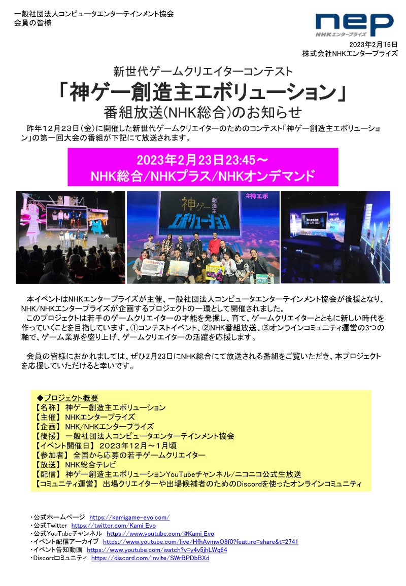 The announcement serves to inform viewers of the upcoming televised presentation of the inaugural “Kami‑Game Creator Evolution” contest, a competition designed to discover and nurture emerging game developers across Japan. The broadcast is scheduled for February 23, 2023 at 23:45 on NHK General, with simultaneous streaming on NHK Plus, NHK On‑Demand, and the contest’s official YouTube and Niconico channels, ensuring broad accessibility for a national audience.