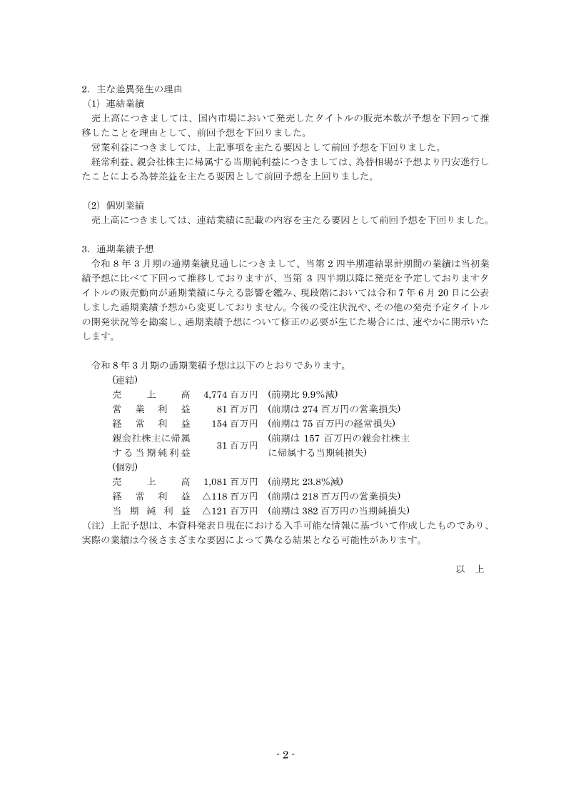 The semi‑annual report for Nippon Ichi Software covers the fiscal period from April 1 to September 30, 2026 (the company’s 32nd interim period). The report presents consolidated financial statements, operational highlights, and governance disclosures for the Japanese video‑game developer headquartered in Gifu. Key financial metrics show a decline in consolidated revenue to ¥2,447 billion (‑20.0 % YoY) and a shift from operating profit to an operating loss of ¥205 billion, driven by higher development and marketing costs. Net income attributable to parent shareholders fell to a loss of ¥171 billion, while comprehensive income dropped to ¥‑396 billion. The company’s equity stood at ¥7,676 billion with a debt‑to‑equity ratio of roughly 0.38, and cash balances decreased to ¥4,282 billion from ¥5,151 billion at the prior period end. Segment analysis indicates that the entertainment business generated ¥2,400 billion in sales but recorded a loss of ¥205 billion, whereas the student‑dormitory and ancillary segment posted modest revenue growth of 23 % but a small operating loss. The report notes continued focus on digital distribution, cloud gaming, and international localization, with new titles slated for simultaneous domestic‑international release. Governance details reveal a fully listed company on the Tokyo Stock Exchange, with 5,151 thousand shares outstanding and a major shareholder holding 38.8 % of equity. The audit section confirms that the interim financial statements were reviewed by an independent firm and found compliant with Japanese GAAP. No material post‑reporting events or significant risks were identified beyond the ongoing macroeconomic uncertainty affecting the gaming sector.