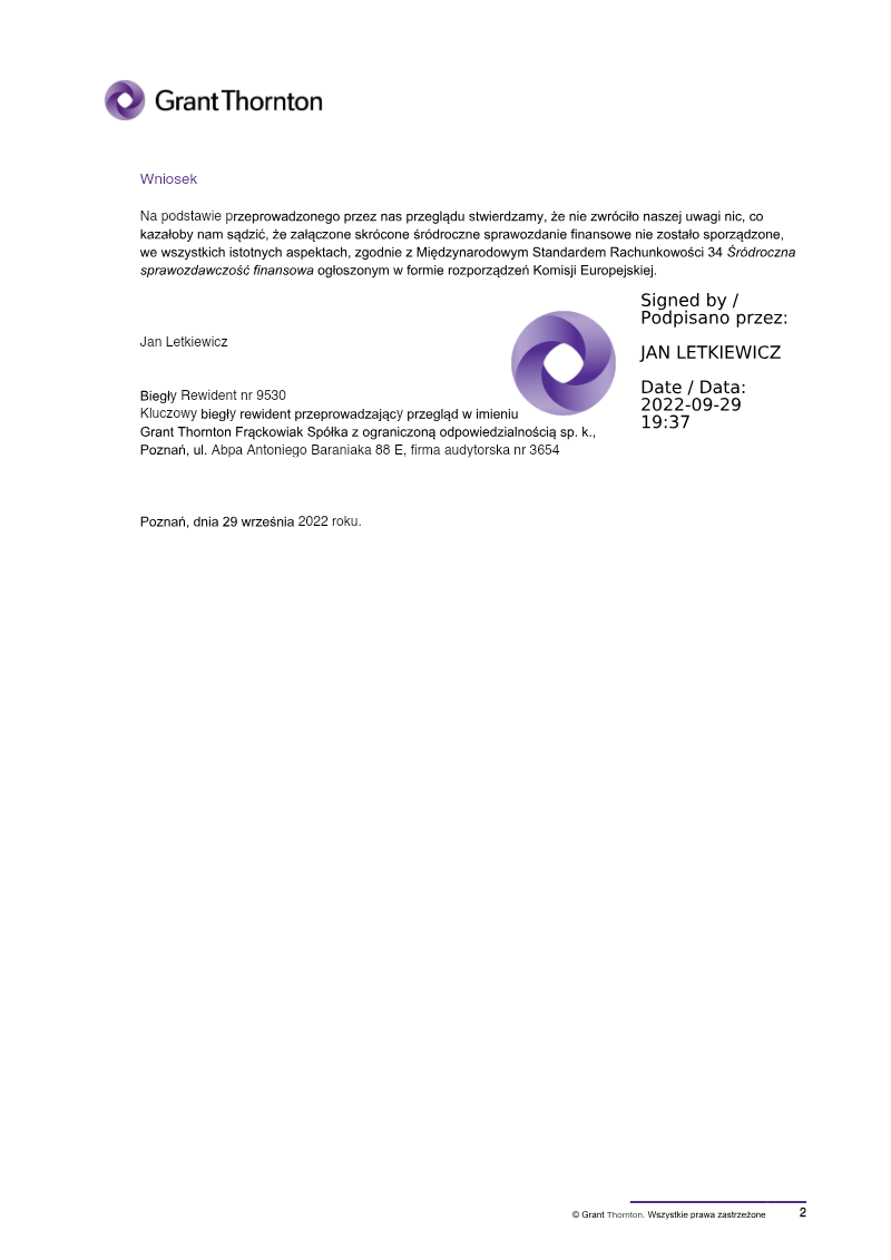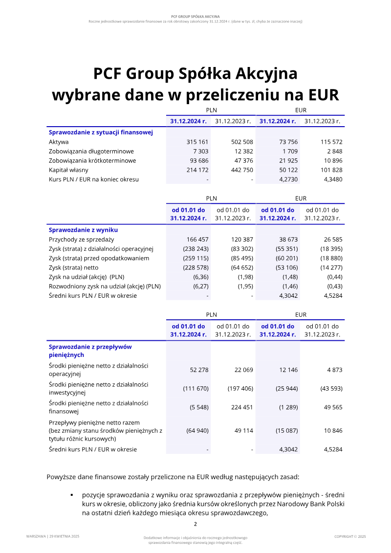 The review confirms that PCF Group’s condensed half‑year financial statements for the period ending 30 June 2024 were prepared in accordance with International Financial Reporting Standard 34 and the European Commission’s regulatory framework. The audit opinion is limited to a review, not an examination, and therefore does not provide assurance that all material matters would have been identified. No findings were noted that would lead the reviewers to believe the statements are not prepared in accordance with applicable standards. Key disclosures highlight significant uncertainties surrounding the company’s ability to continue as a going concern. Management has outlined actions to secure additional financing aimed at sustaining its strategy of developing and publishing proprietary games. While management remains optimistic, the review notes that success is not guaranteed. The company reported intangible assets related to in‑process development work amounting to PLN 239,487 thousand as of 30 June 2024. These assets meet the criteria for capitalization under IAS 38, provided that sufficient financial resources are available to complete development. Management has produced a five‑year cash‑flow forecast that incorporates assumptions about future game development, potential new projects, and the likelihood of securing further funding. The review cautions that this forecast depends on uncertain future events. The scope of the review covered all financial statements, including balance sheet, income statement, comprehensive income, equity changes, and cash‑flow statement for the first half of 2024. The methodology followed the Polish Standard 2410, equivalent to International Standard on Review Engagements 2410, involving analytical procedures and inquiries of finance and accounting personnel. The review was conducted by Grant Thornton Polska Prosta Spółka Akcyjna, with the key auditor Jan Letkiewicz leading the engagement.