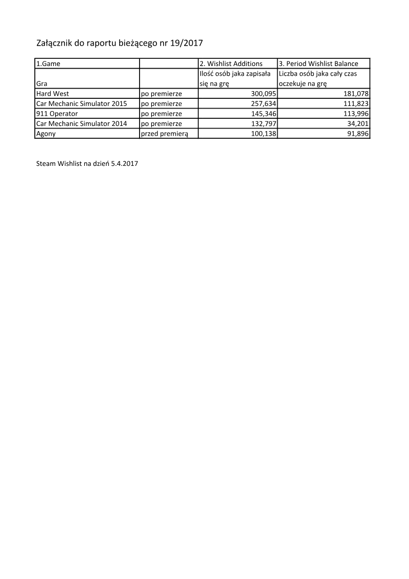 This financial disclosure provides a snapshot of consumer interest and market demand for key titles within a Polish game development and publishing portfolio as of April 5, 2017. By tracking Steam Wishlist metrics, the data distinguishes between historical interest and current active demand for five specific titles at various stages of their lifecycles. The figures serve as a primary indicator of potential long-term sales and the effectiveness of marketing efforts within the global PC gaming market.