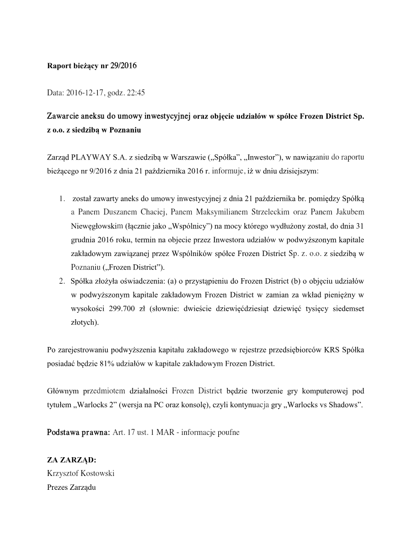 Current Report No. 21/2016: Conclusion of Shareholder Agreement for Subsidiary