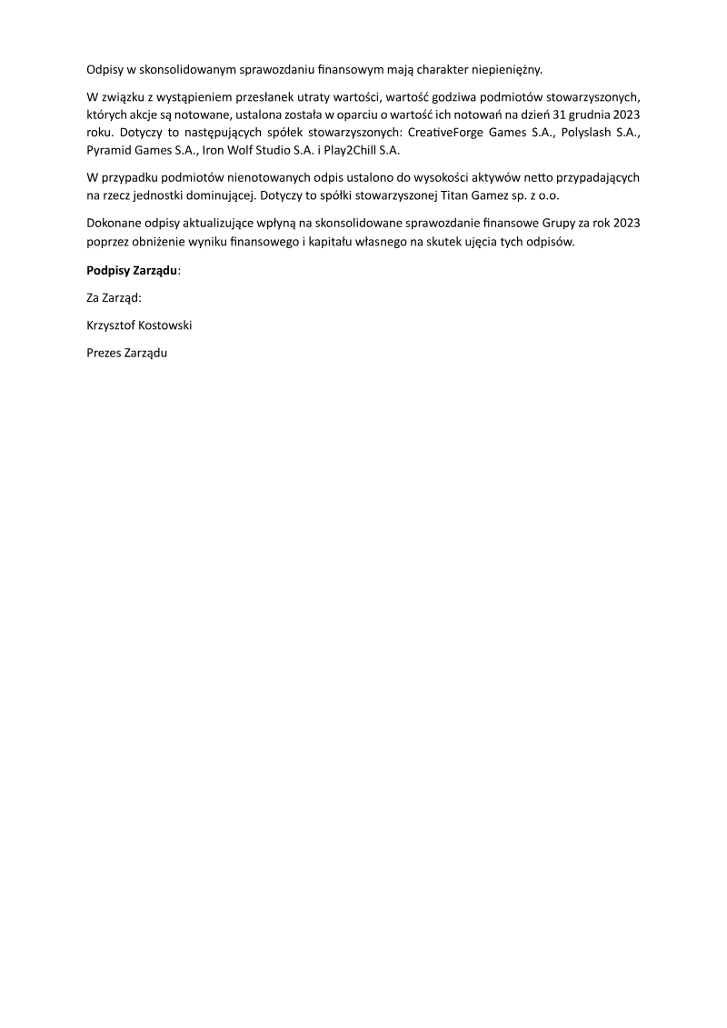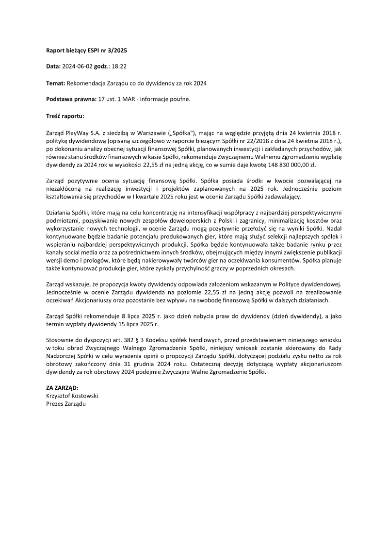 The Ordinary General Meeting of PlayWay S.A., held on June 20, 2024, formalized the company’s financial and operational performance for the 2023 fiscal year. Representing 74.54% of the share capital, shareholders ratified the 2023 activity reports and consolidated financial statements, which revealed a net profit of 106.7 million PLN and total assets valued at 534.9 million PLN. The meeting also confirmed the individual company net profit of 144 million PLN, leading to the authorization of a substantial dividend payment of 21.82 PLN per share. This dividend, totaling 144.01 million PLN, was sourced from both 2023 profits and retained earnings, with distribution scheduled for July 2024.