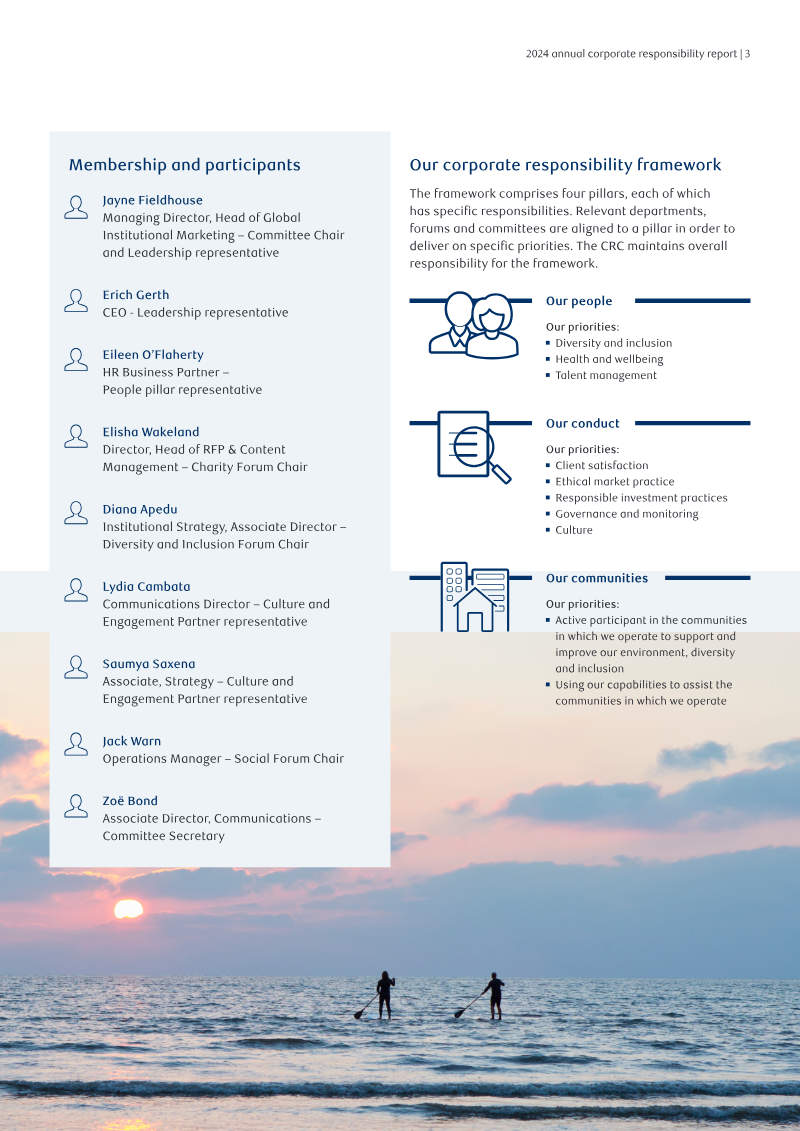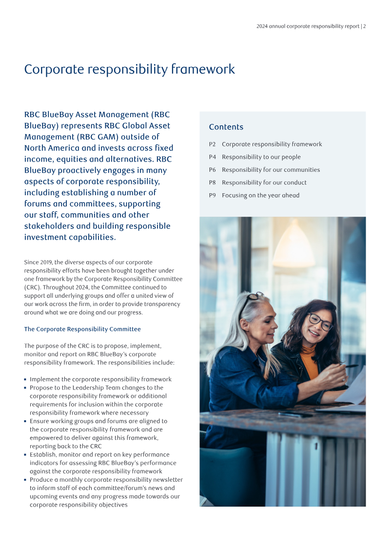 The 2024 Annual Corporate Responsibility Report outlines the strategic framework and operational progress of RBC BlueBay Asset Management regarding its social, ethical, and community-focused initiatives. The primary thesis centers on the integration of corporate responsibility into the firm’s core business model, asserting that a transparent, inclusive, and community-engaged culture drives superior outcomes for both clients and employees. The firm operates under a centralized Corporate Responsibility Committee that monitors key performance indicators across four pillars: people, communities, conduct, and responsible investment.