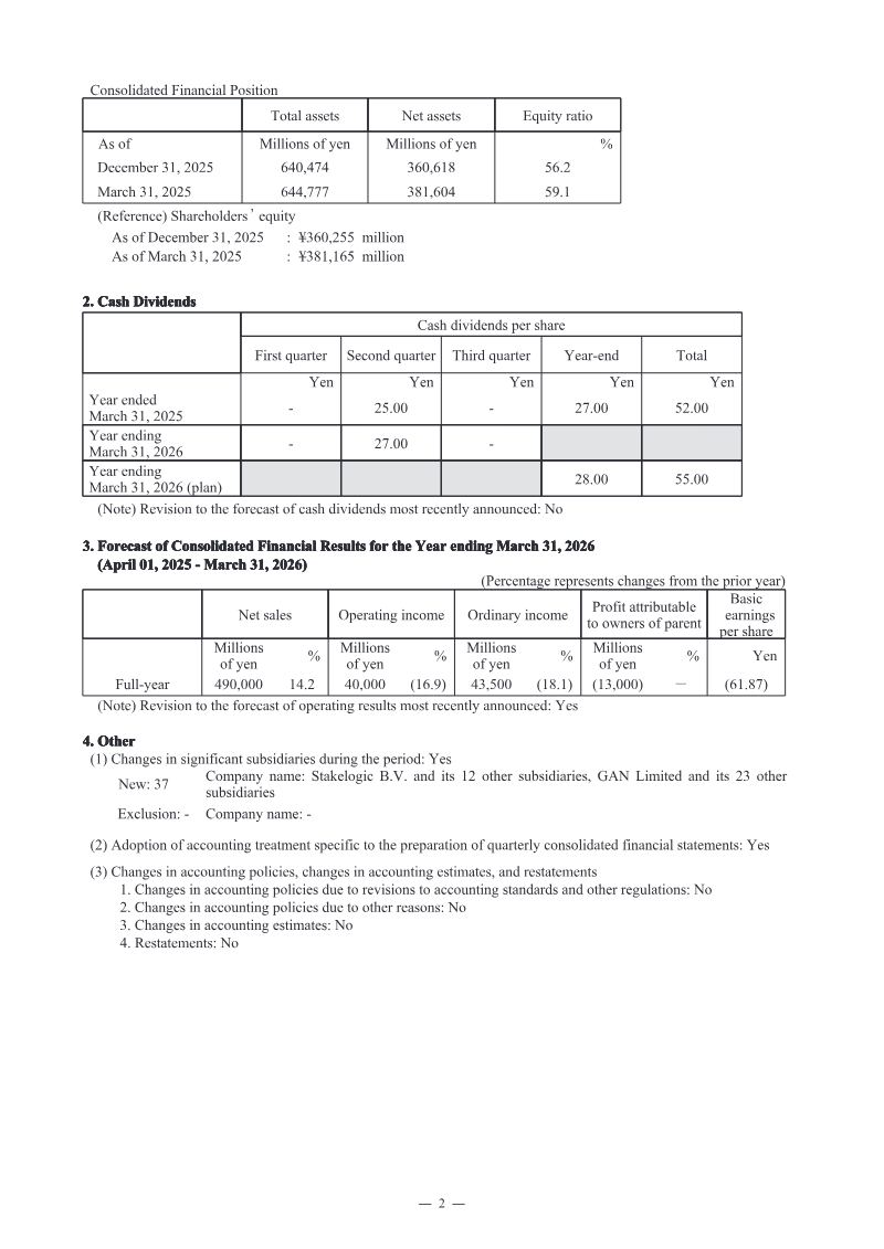 Segment performance varied: Entertainment Contents sales increased modestly (1.5 %) but ordinary income fell 34.3 % to ¥24,676 million; Pachislot & Pachinko sales declined 4.0 % with ordinary income dropping 46.0 %; Gaming revenue surged 438.5 % to ¥16,795 million but incurred a loss of ¥247 million due to consolidation of newly acquired GAN and Stakelogic. The Group’s balance sheet shows total assets at ¥640,474 million and net equity of ¥360,618 million, with the equity ratio at 56.2 %. Current liabilities rose to ¥109,254 million, lowering the current ratio to 35.1 %. Treasury stock increased from ¥54,866 million to ¥26,459 million as the company retired 20 million shares and subsequently acquired up to 12 million shares at a maximum cost of ¥20 billion. The results reflect significant impairment impacts, a shift in capital allocation policy toward shareholder returns, and ongoing adjustments to the Gaming and Entertainment segments amid new acquisitions.
