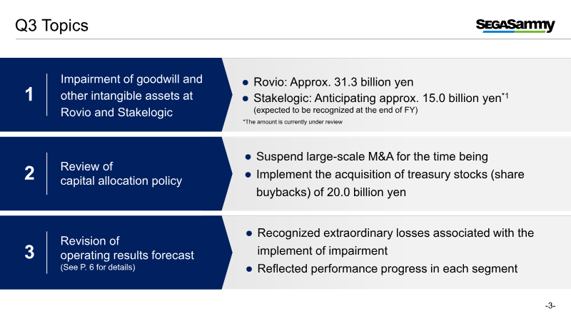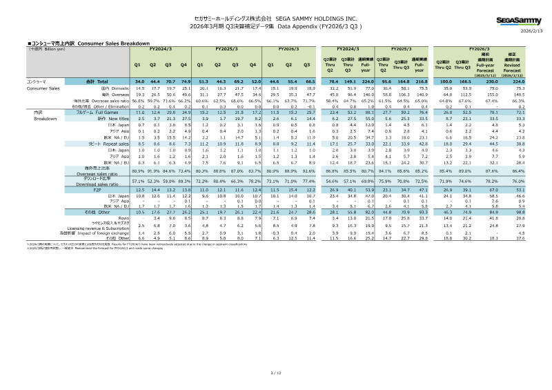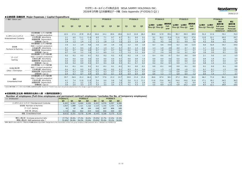 The quarterly consolidated financial results for SEGA SAMMY HOLDINGS INC. cover the nine‑month period ending December 31, 2025, within a fiscal year that ends March 31, 2026. Net sales rose 4 % to ¥335,232 million from ¥322,316 million in the prior year. Operating income fell sharply by 54.6 % to ¥19,844 million, driven largely by a ¥31,380 million impairment loss on goodwill and other intangible assets related to the Rovio subsidiary. Ordinary income declined 51.8 % to ¥23,838 million, and profit attributable to owners of parent turned a loss of ¥16,894 million. Adjusted EBITDA contracted 93.6 % to ¥3,482 million from ¥54,518 million, reflecting the extraordinary impairment and restructuring costs. Basic earnings per share shifted from a profit of ¥194.14 to a loss of ¥79.98.